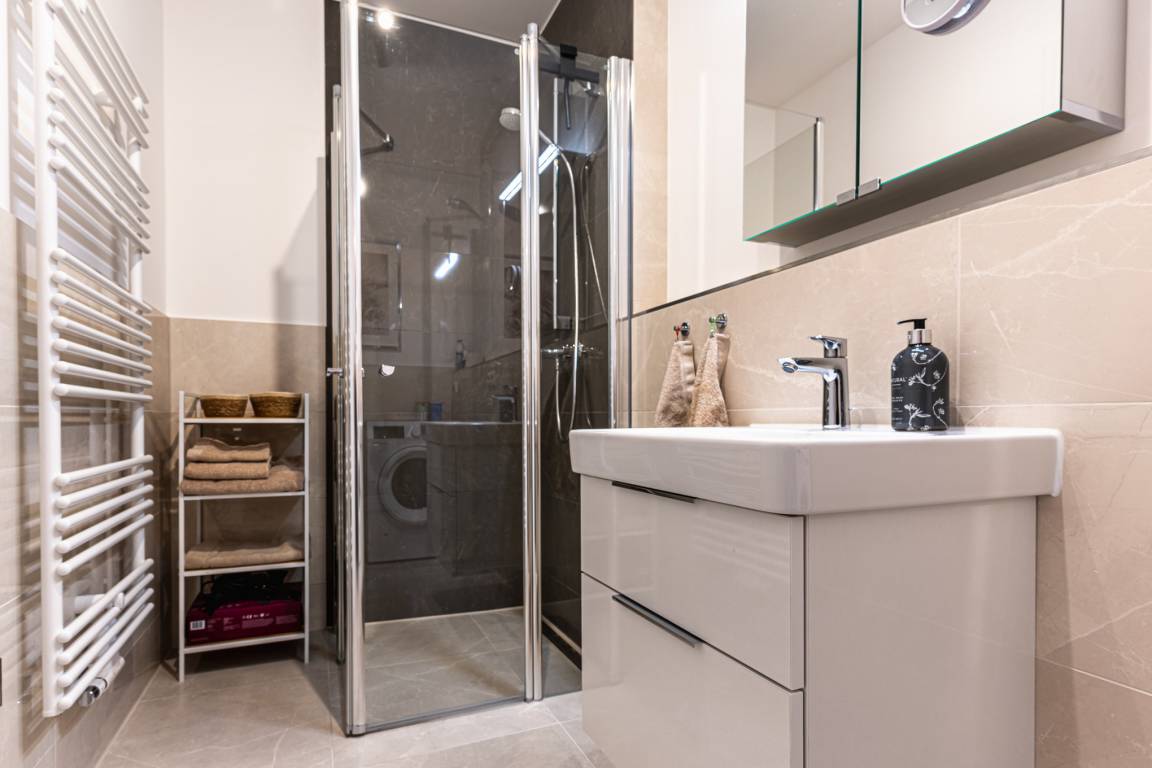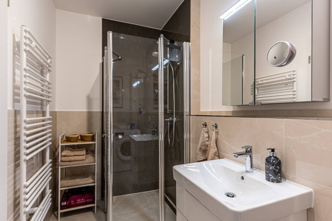 Das stimmungsvolle Badezimmer verfügt über eine ebenerdige Dusche, WC sowie einem modernem Waschtisch mit großem, beleuchtetem Spiegel. Eine Waschmaschine sowie ein Reisefön sind vorhanden.
