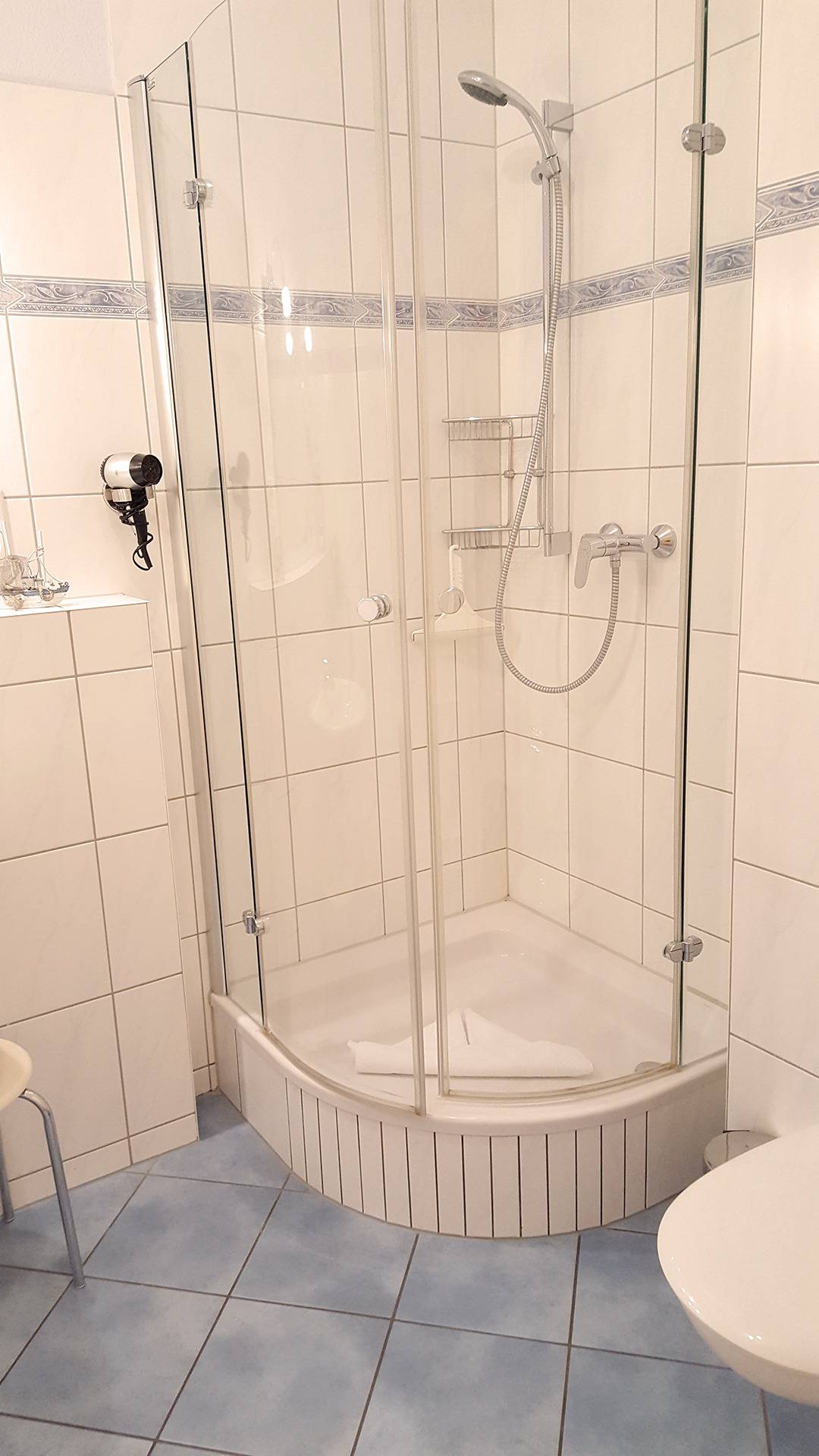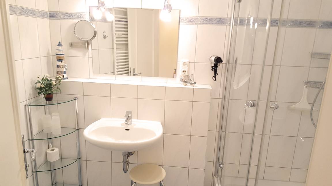 Das weiße Bad mit Dusche und Waschtisch macht die Wohnung komplett.