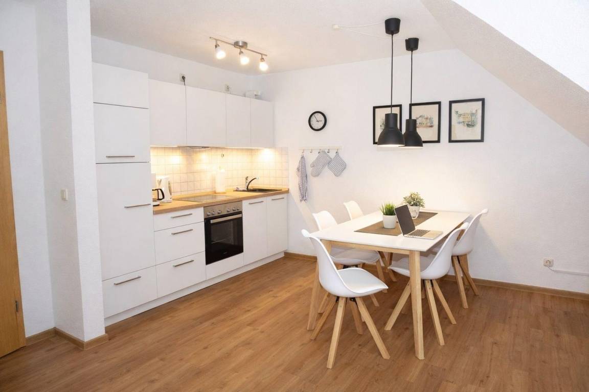 in der ansprechenden, 63 qm großen Ferienwohnung für bis zu 4 Personen. Sie erstreckt sich über zwei Ebenen im Obergeschoss eines Vier-Familienhauses in Kühlungsborn-West.