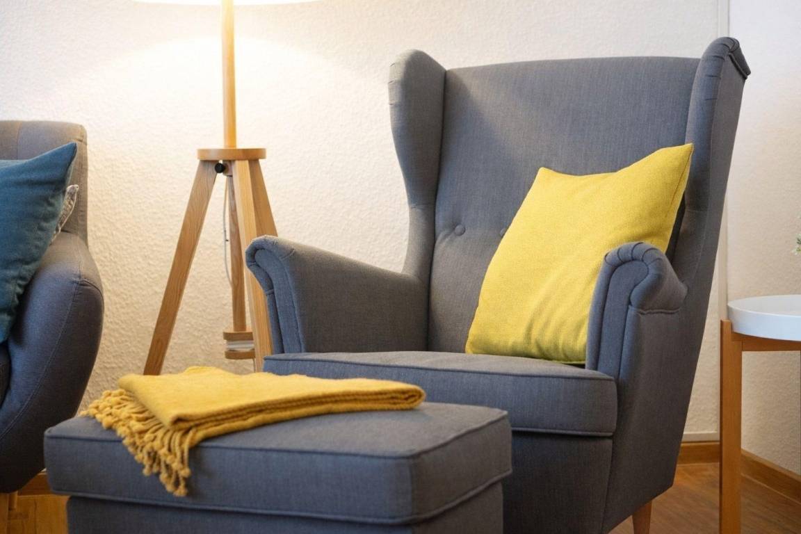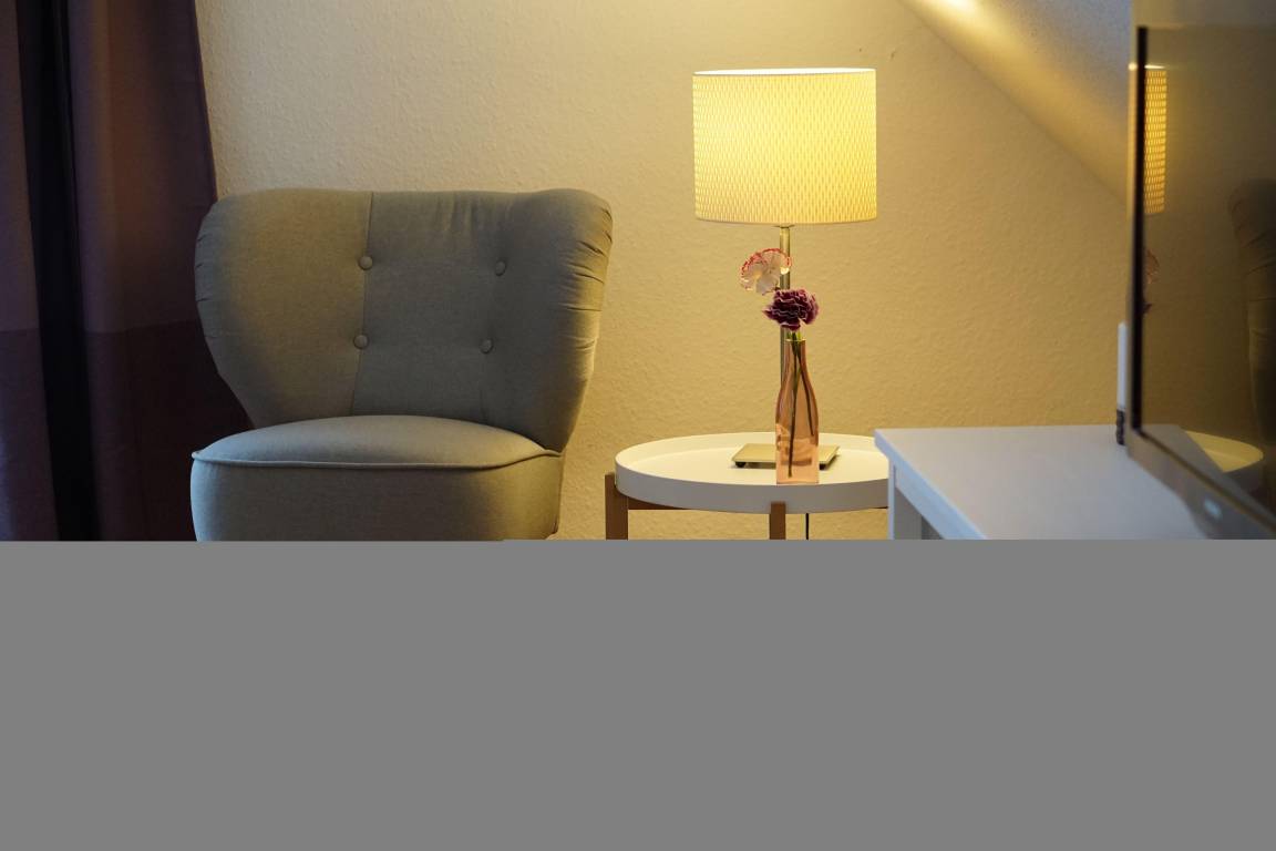 steht Ihnen ein gemütlicher Sessel sowie ein zusätzlicher Fernseher für erholsame Stunden zur Verfügung. Ein Kleiderständer und der Unterschrank des TV bieten ausreichend Platz für Ihre Garderobe.