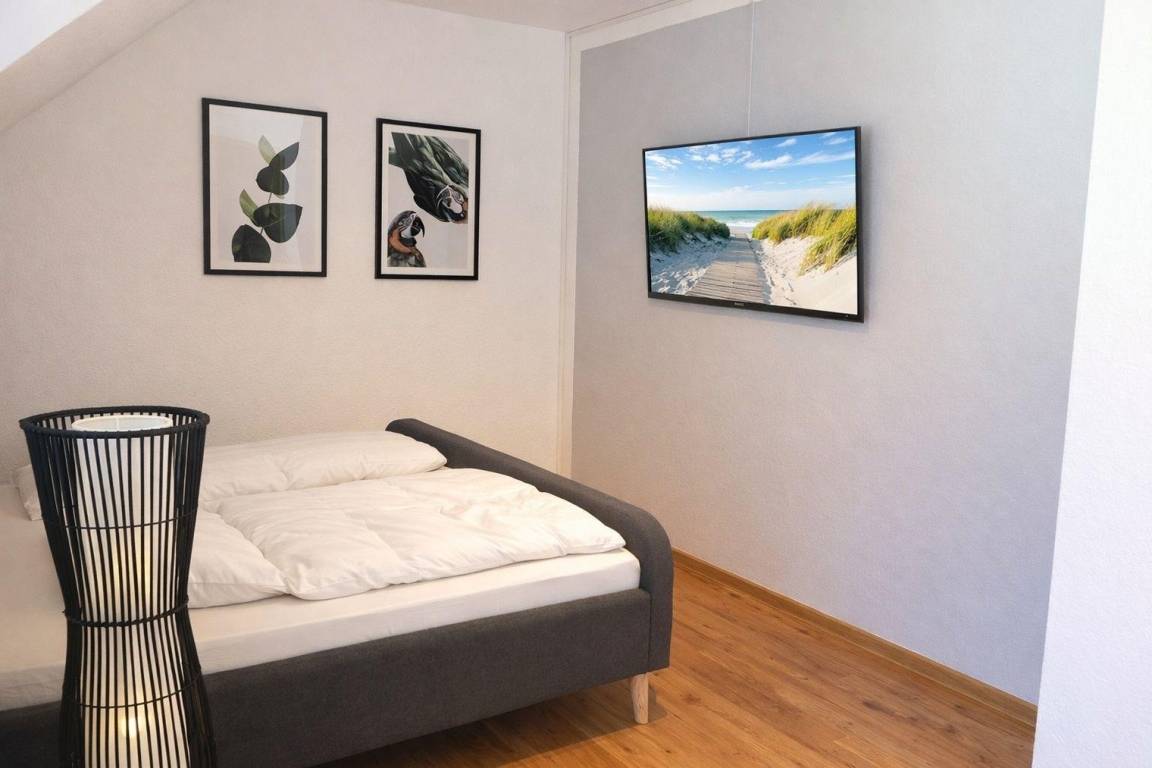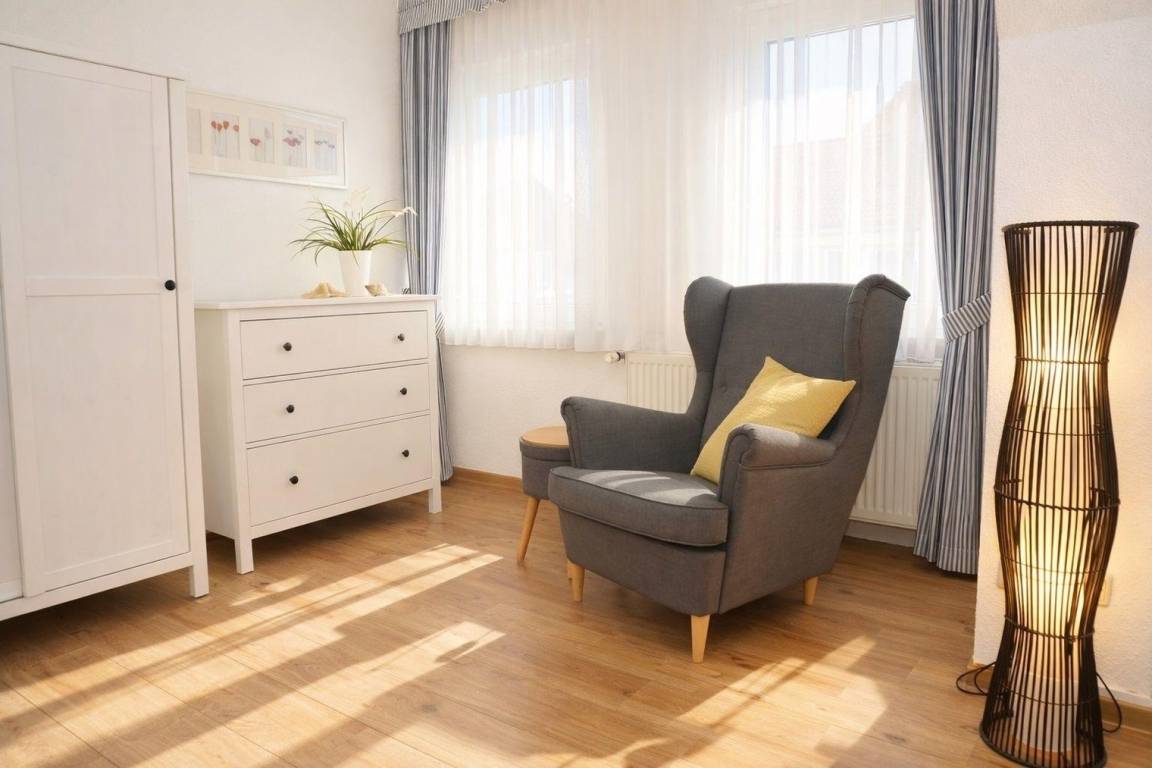 Das erste Schlafzimmer ist mit einem großen Doppelbett (1,80 x 2,00 m) und TV ausgestattet. Ein geräumiger Kleiderschrank und eine Kommode bieten ausreichend Platz für Ihre Urlaubsgarderobe. Im gemütlichen Ohrensessel können es sich die lesefreudigen Gäste mit einem Buch gemütlich machen.