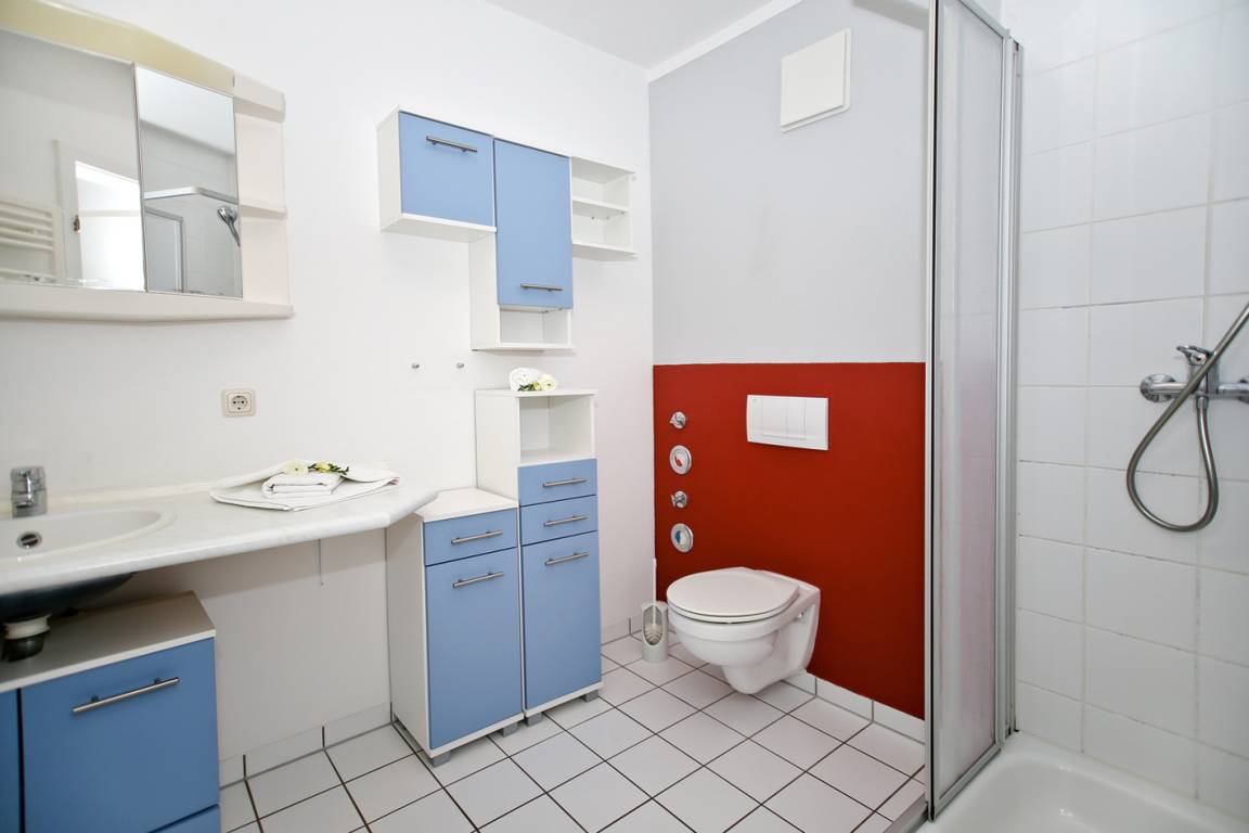 Das Bad verfügt über ein Waschbecken mit ausreichend Ablagefläche sowie WC und Dusche.