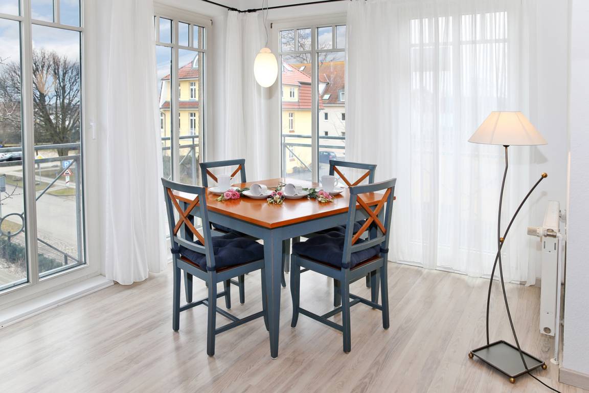 Die lichtdurchflutete Wohnung befindet sich im 2. Obergeschoss der Villa auf der Süd-Ost-Seite im Turm und bietet bis zu 4 Personen Platz für einen erholsamen Urlaub.