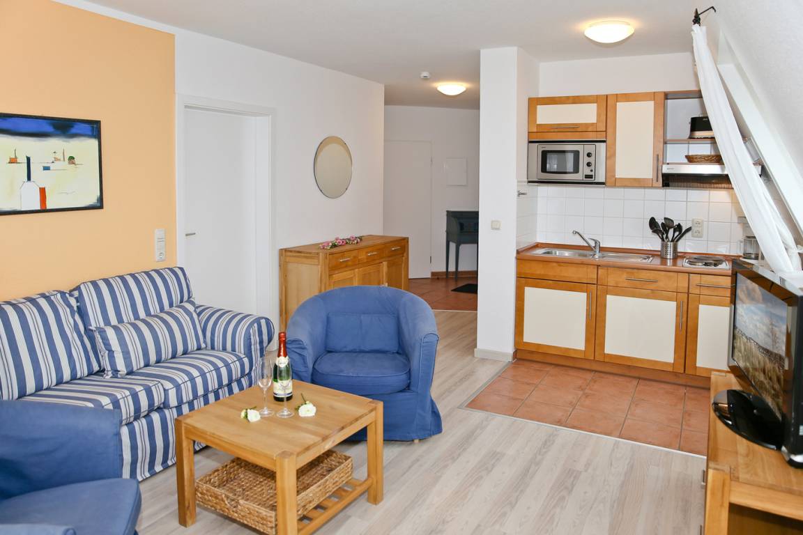 Die angrenzende Küchenzeile verfügt über eine Mikrowelle, Kühlschrank mit Gefrierfach und ein 2-Platten-Kochfeld.