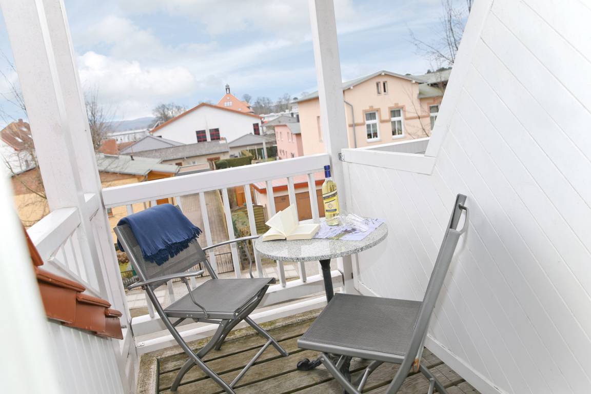 Der überdachte Balkon ist nach Süden ausgerichtet und lädt zum Entspannen ein.
