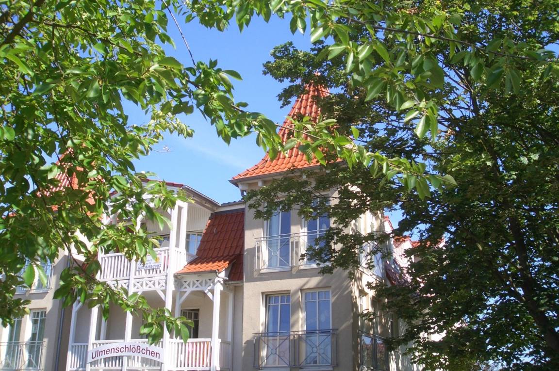 Das „Ulmenschlösschen" liegt in einer Seitenstraße neben der Strandstraße (Hauptstraße in Kühlungsborn-Ost) in unmittelbarer Nähe zum Stadtwald und der Bummelmeile.