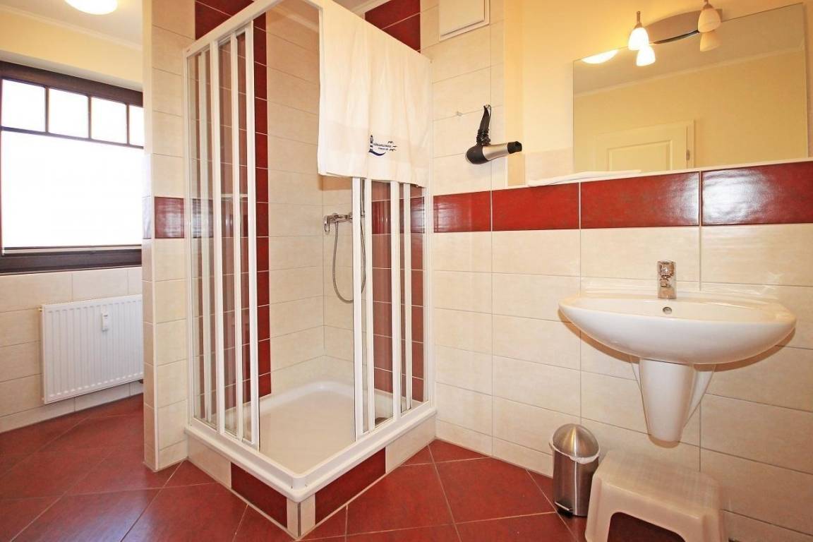 Das moderne Bad ist mit einer Dusche, WC sowie Waschbecken ausgestattet und verfügt über Fußbodenheizung sowie über einen Haartrockner.