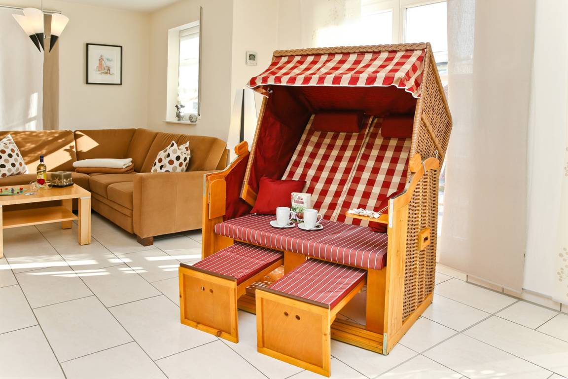 Der großzügige Wohnbereich ist eingerichtet mit einer Sitzgruppe und moderner Hifi-Anlage und Flachbild-TV (SAT-Schüssel).