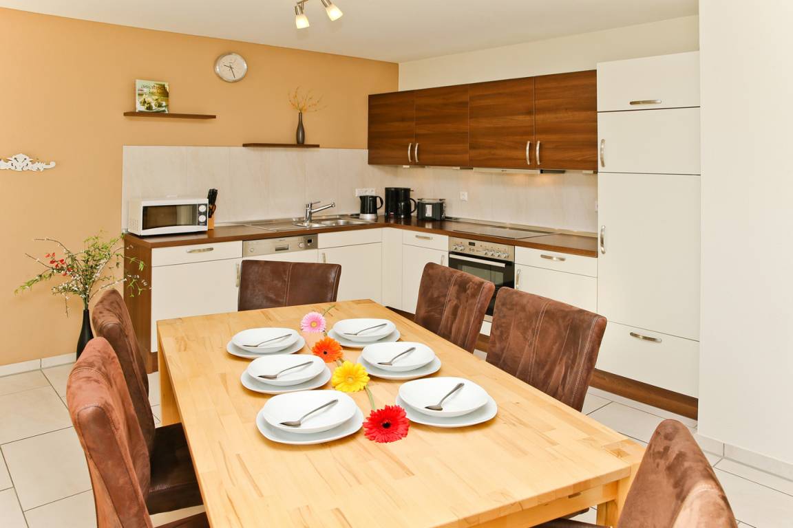 Die vollausgestattete Einbauküche mit Backofen, 4-Platten-Ceran-Feld, Mikrowelle und Geschirrspüler sowie einem Esstisch für 6 Personen ist im Wohnbereich