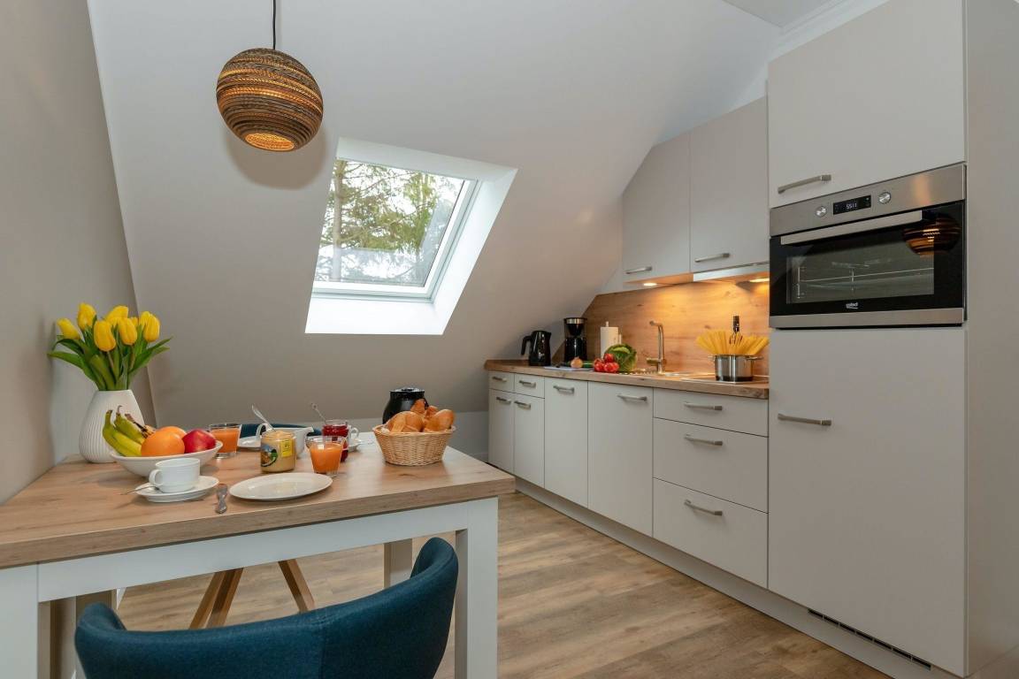 In der komplett ausgestatteten Küche können Sie morgens bei einer leckeren Tasse Kaffee richtig wach werden oder zusammen mit Ihrem Liebsten ein tolles Abendessen zaubern und genießen. Hierfür steht ein Cerankochfeldherd, ein Backofen, ein Kühlschrank, eine Spülmaschine, Wasserkocher, Kaffeemaschine und Toaster zur Verfügung. Selbstverständlich haben Sie hier ausreichend Geschirr für 2 Personen.