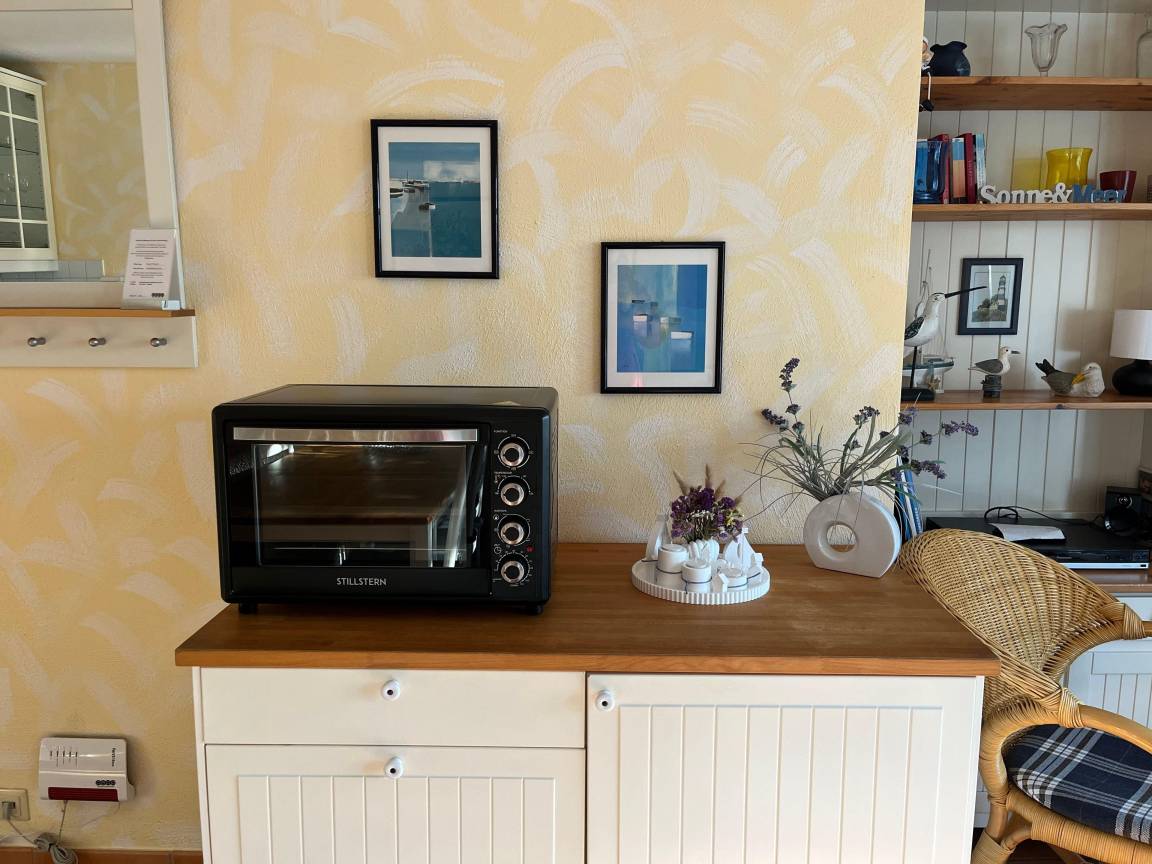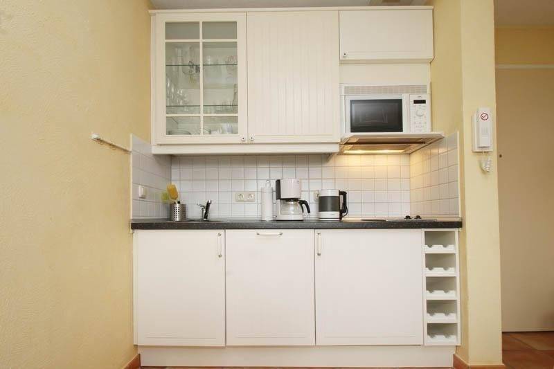 Die an den Wohnraum angrenzende Küche ist mit großem Esstisch, Geschirrspüler, Kühlschrank mit Gefrierfach, Handmixer, 2-Platten-Herd, Mikrowelle sowie einem kleinen Tischbackofen und allem, was Sie für die Selbstverpflegung benötigen, ausgestattet.
