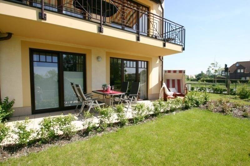 Durch die Ecklage der Wohnung haben Sie den Vorteil einer schönen großen Terrasse mit West- und Südlage, die mit bequemen Gartenmöbeln inkl. Strandkorb ausgestattet ist. Eine Wohlfühloase im Außenbereich.