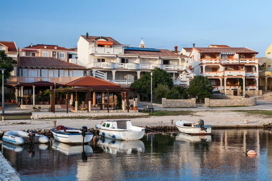 Das nächste Lebensmittelgeschäft sowie ein Bäcker sind ca. 300m entfernt. Der nächstgrößere Ort Novalja ist ca. 6 km entfernt und bietet zahlreiche Einkaufsmöglichkeiten, Restaurants sowie Sport- und Unterhaltungsangebote. Es ist ein idealer Ausgangspunkt für Ausflüge zu den Sehenswürdigkeiten Plitvice See, Krka Wasserfälle, Kornaten oder benachbarte Inseln.