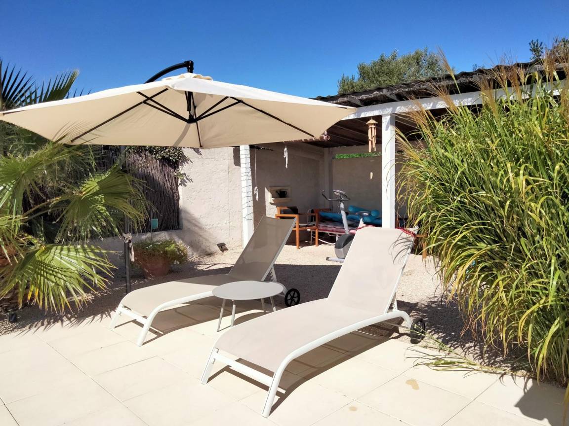 Klimaanlage, Terrasse(alleinige Nutzung, 40 m²), Garten(Gemeinschaftliche Nutzung mit dem Eigentümer, angelegt, illuminiert, umzäunt, 1600 m²), Gartenmöbel, Liegen, BBQ(Gas), 1x Parkplatz, Liegestühle, Parasol, Pool(Gemeinschaftliche Nutzung mit dem Eigentümer, im Garten, Wasseralarm, umzäunt, 10 x 5 m., Tiefe: 1.4m, geöffnet von Mai bis einschließlich Mitte Okt), 1x Kinderbett (ohne Bettwäsche), 1x Hochstuhl