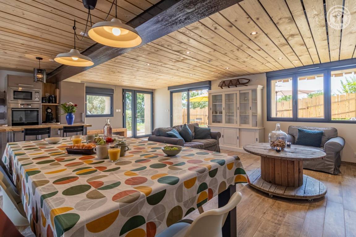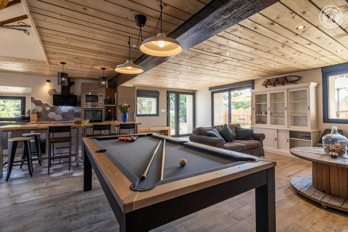 Großes Einfamilienhaus, neben dem Haus des Eigentümers und angeschlossen an die Porzellanmalerei-Werkstatt des Eigentümers. Im Erdgeschoss: Wohnküche-Lounge mit Esstisch, der sich in einen Billardtisch verwandeln lässt. Separates WC mit Waschbecken. Im 1. Stock: 1 Studio mit Küchenzeile, Wohnzimmer, Esstisch und Mezzanine (1 Doppelschlafsofa 160 x 200 cm / 2 Einzelbetten 80 x 200 cm, die zu 1 Doppelbett 160 x 200 cm zusammengestellt werden können). 2 Familienschlafzimmer mit Mezzanine (4 Einzelbetten 80 x 200 cm, die zu 2 Doppelbetten 160 x 200 cm zusammengestellt werden können). Jedes Zimmer verfügt über ein eigenes Badezimmer (Dusche und WC). Waschküche. Terrasse und kleiner Garten mit Gartenmöbeln und Essbereich im Freien. Privater Parkplatz. Tischtennisplatte vorhanden. Klimaanlage in allen Zimmern. Gesamte Wohnfläche inkl. Dachgeschossflächen: 10m².