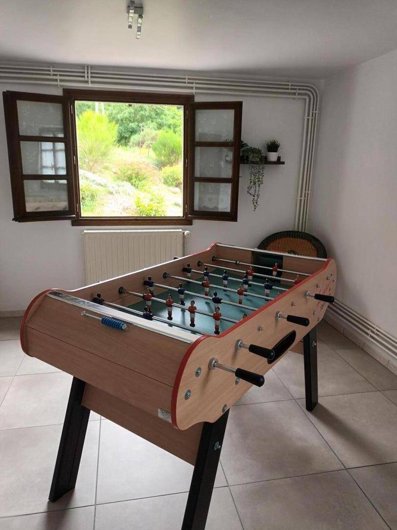 Ein Ruheraum mit Tischfußball, ein Badezimmer (Dusche), separates WC, ein mit Tisch und Stühlen ausgestatteter Raum.