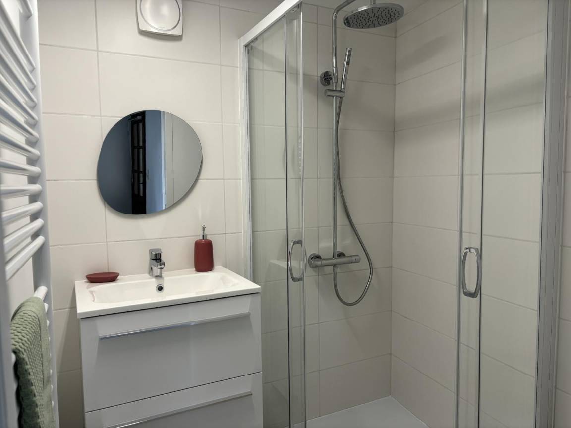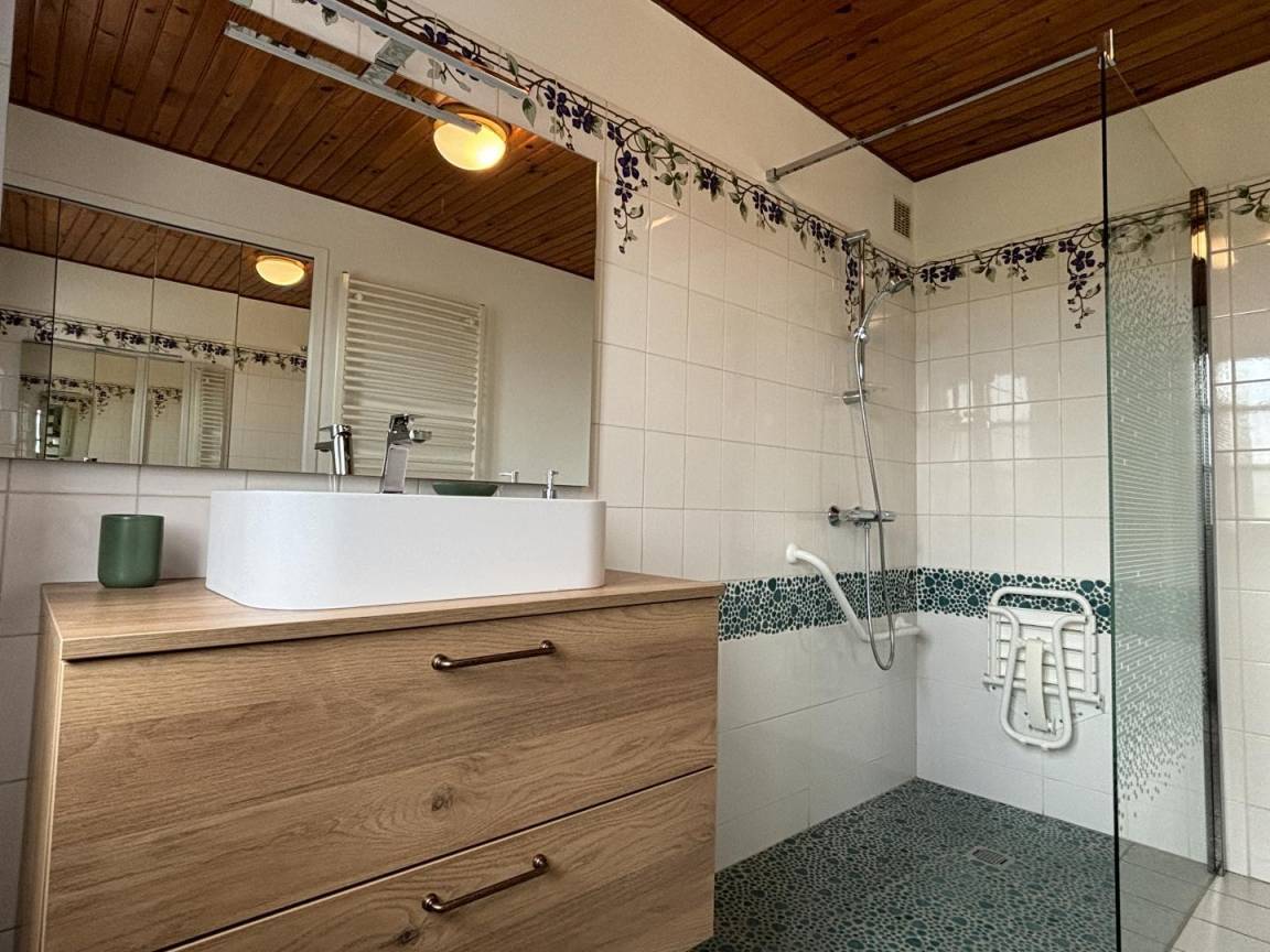 Zimmer mit Holzofen, Badezimmer (Dusche mit Haltegriff und Sitz), separates WC, ein Schlafzimmer für 2 Personen.
