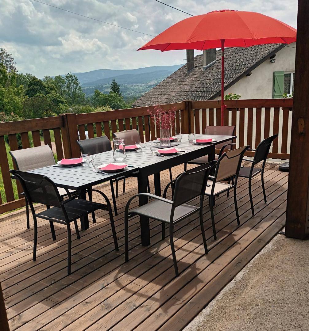 Genießen Sie vom Wohnzimmer aus die Terrasse und bewundern Sie die Täler.