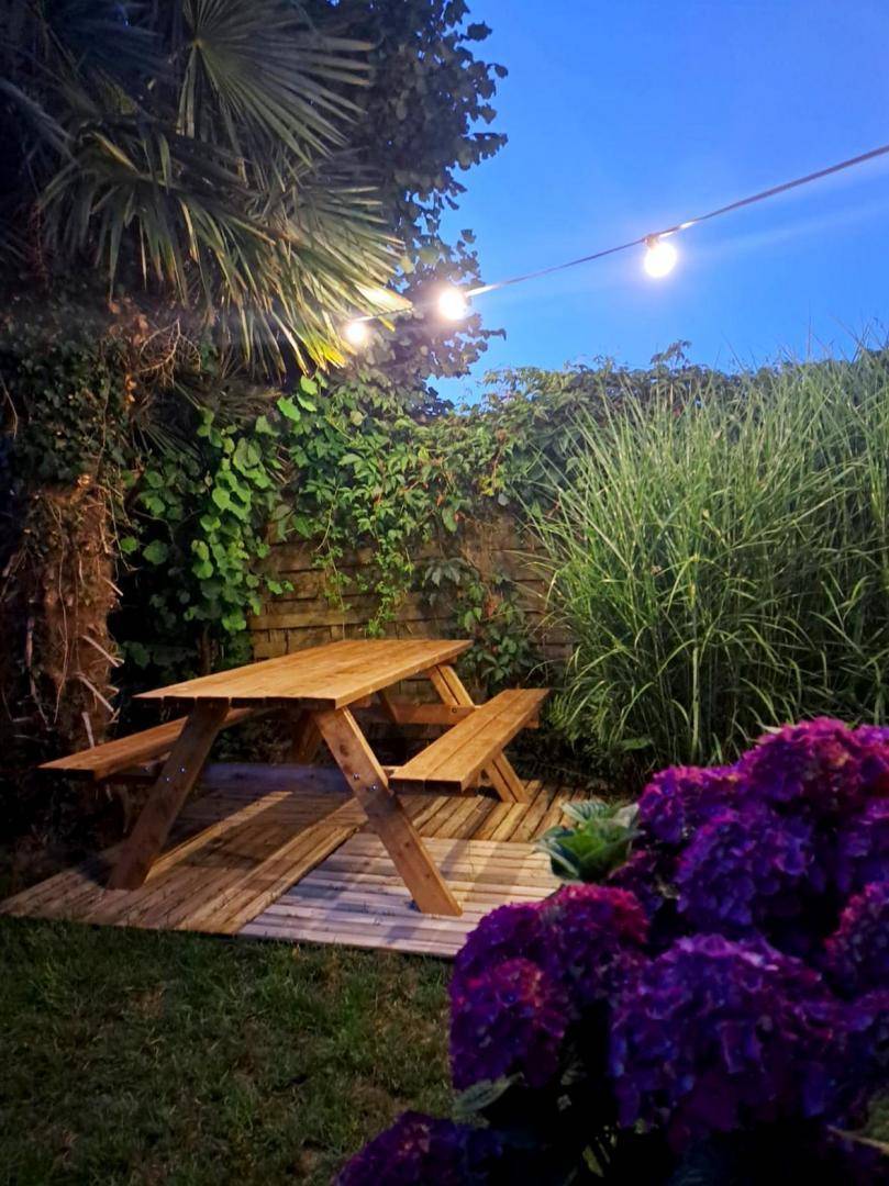 Garten mit Esstisch, elektrischer Plancha, Liegestühlen.