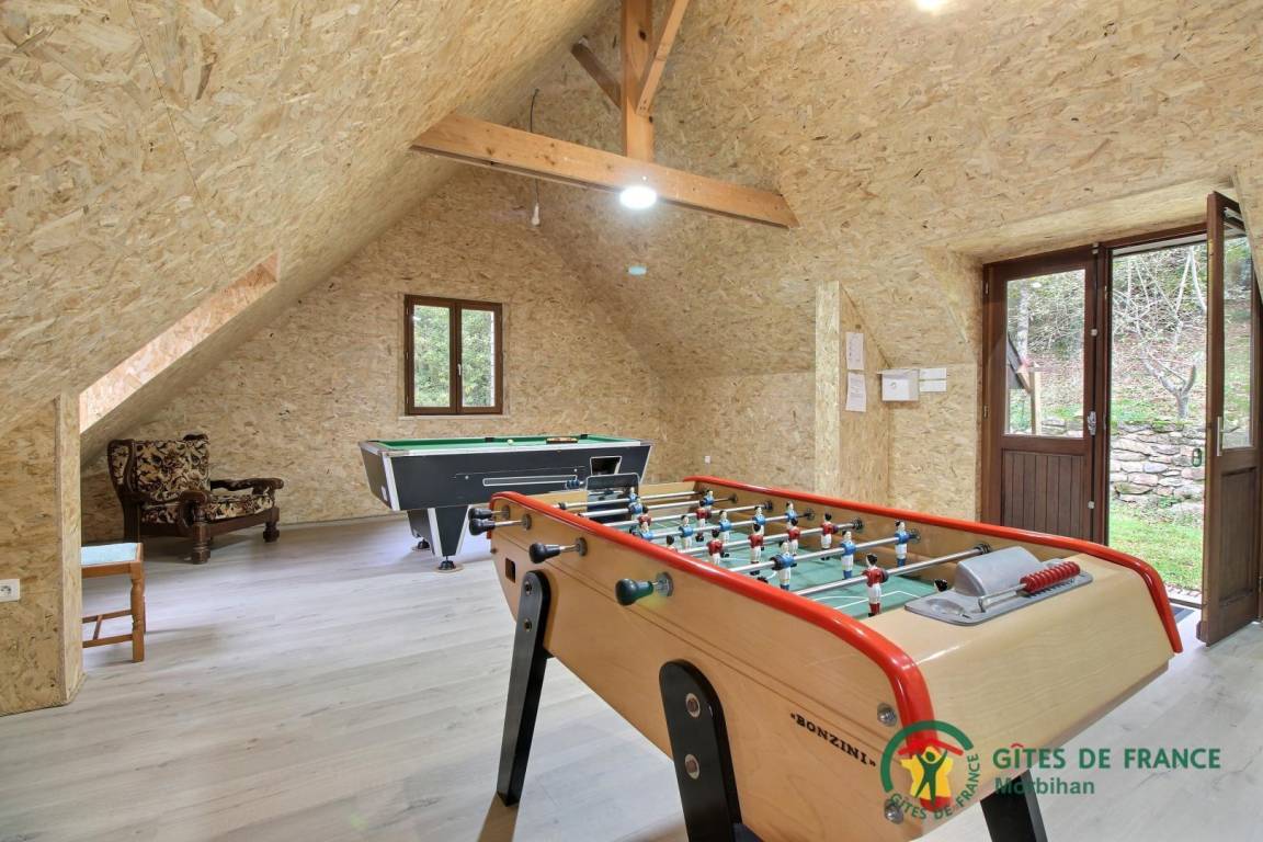 Lust auf Natur? Fernab vom Trubel der Küste können Sie hier bei Ihrem nächsten Urlaub die grüne Umgebung dieses herrlichen Anwesens genießen. Auf dem Land, im Blavet-Tal, können Sie schöne Wanderungen rund um den Nationalwald von Floranges, Angeln, Outdoor-Sportarten unternehmen ... 7 km entfernt können Jung und Alt den Park der Attraktion Kingoland genießen! Für die Freuden des Meeres ist der Golf von Morbihan 40 Minuten entfernt. Nach Ihren Tagen voller Ausflüge und Entdeckungen in unserer schönen Abteilung werden Sie das beheizte Innen-Außenschwimmbad oder die Terrasse zum Entspannen zu schätzen wissen. Das Anwesen liegt in der Ruhe einer Sackgasse und besteht aus drei traditionellen Steinhäusern in grüner Umgebung. Hier werden Sie den großen Garten mit Spielen für Kinder, einen Lehrbauernhof sowie das Spielzimmer mit Billard, Tischfußball und Darts zu schätzen wissen.