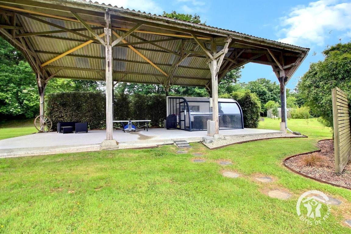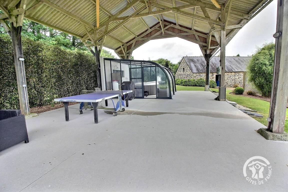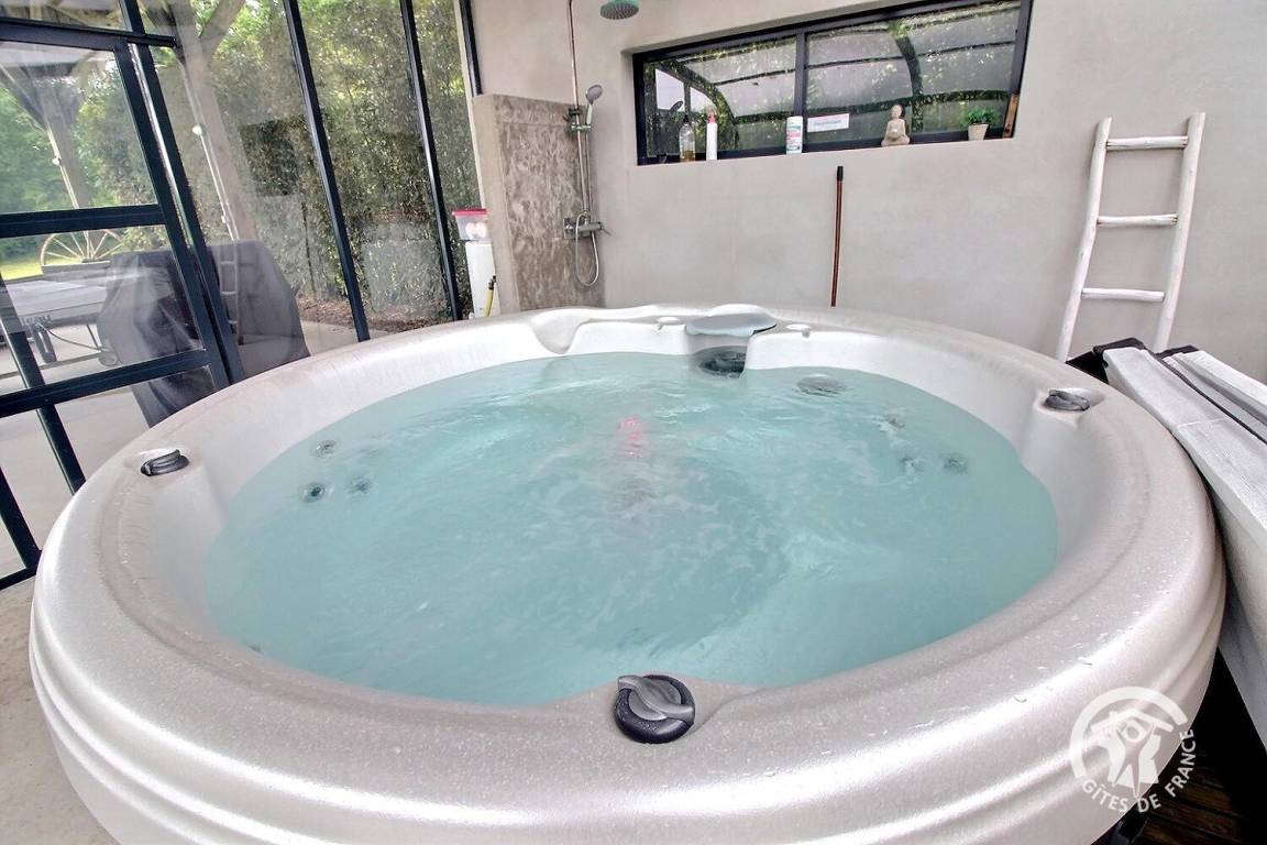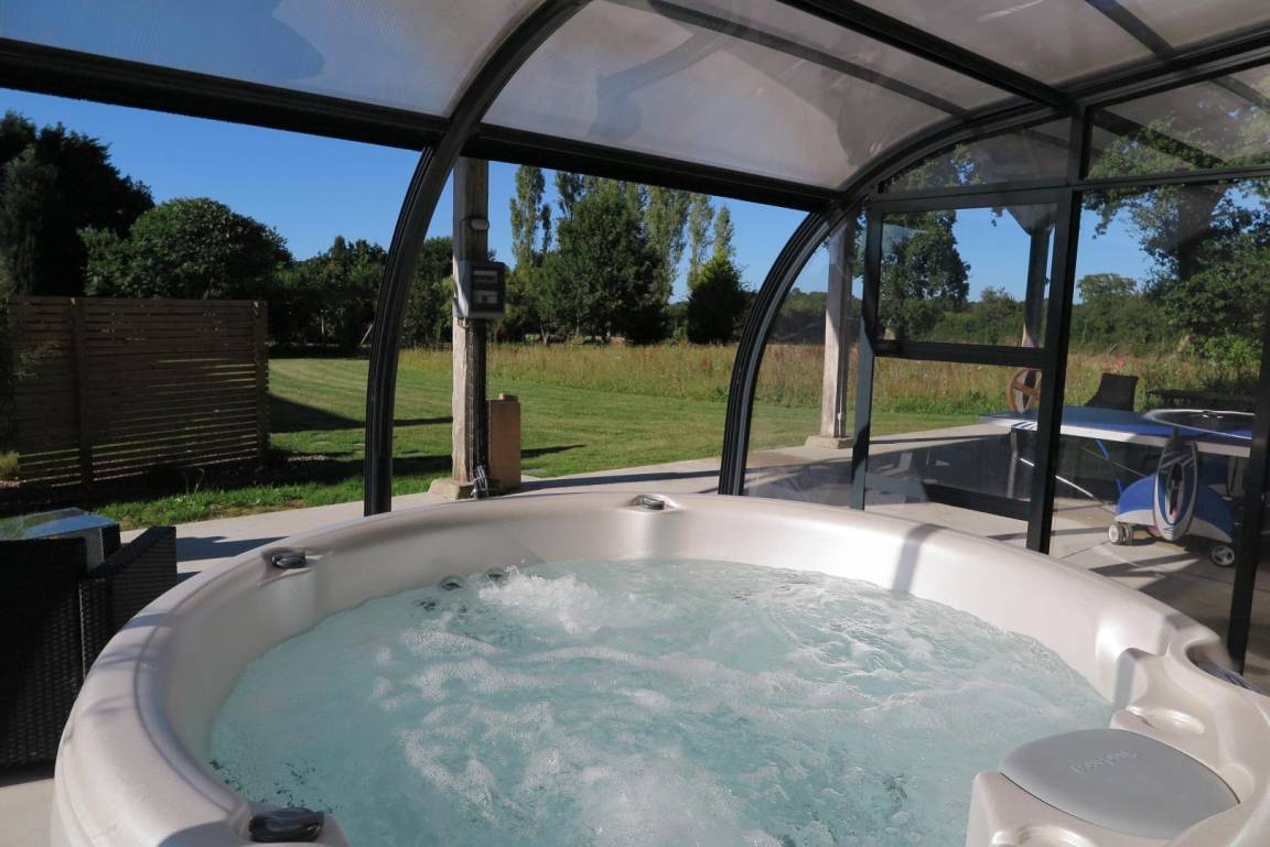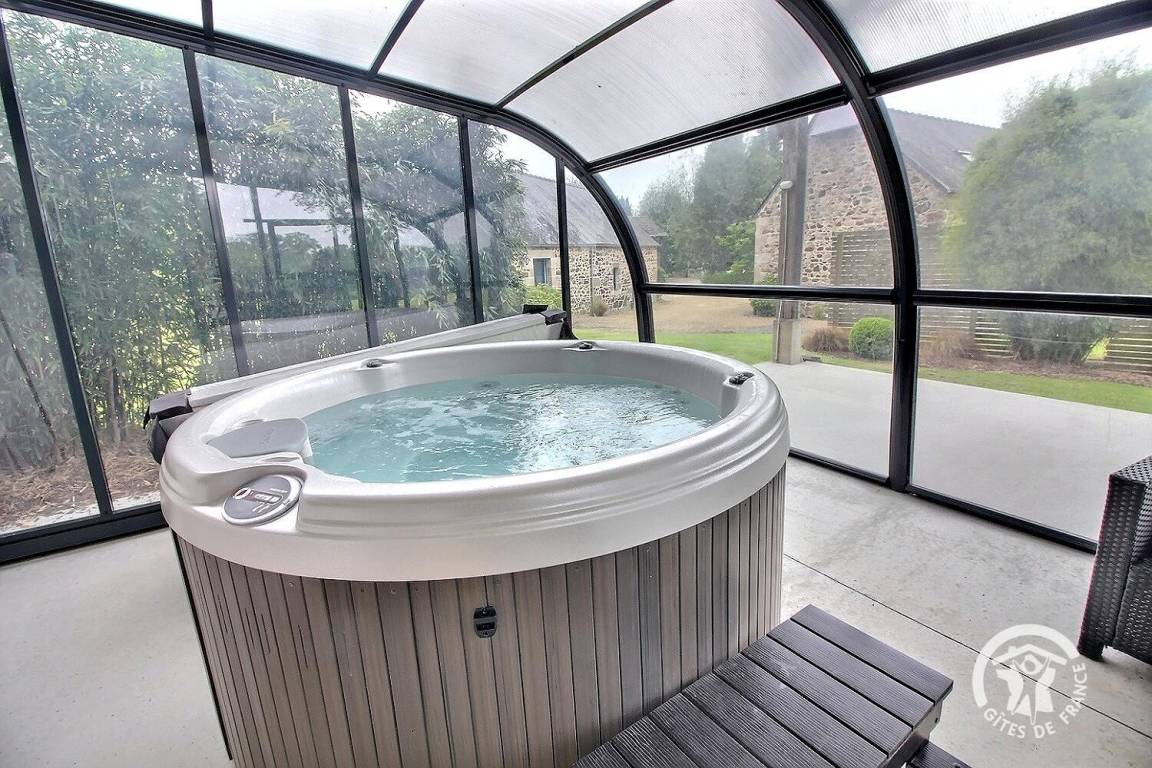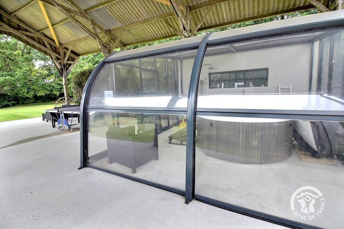 Entspannungsbereich im Freien von 100 m², der den beiden Gîtes gemeinsam ist, einschließlich eines überdachten Spas, das den beiden Gîtes gemeinsam ist und das ganze Jahr über verfügbar ist.