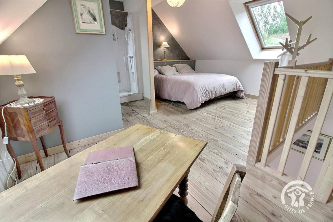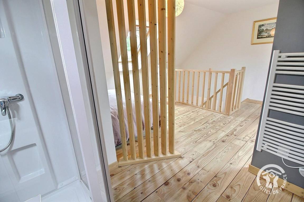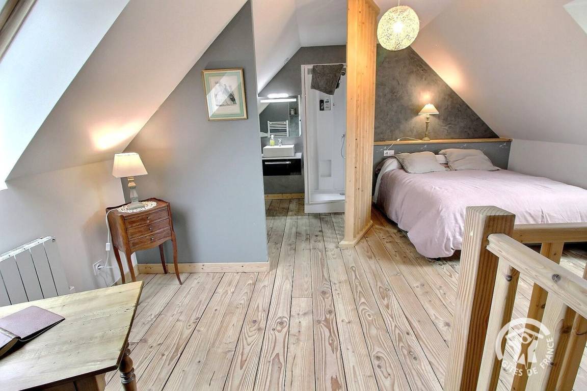 1 großes Schlafzimmer im Zwischengeschoss bietet ein Kingsize-Bett 160 x 200 (Bettwäsche wird bereitgestellt und das Bett ist bei Ankunft bezogen) und ein Badezimmer mit Dusche, das zum Schlafzimmer hin offen ist.