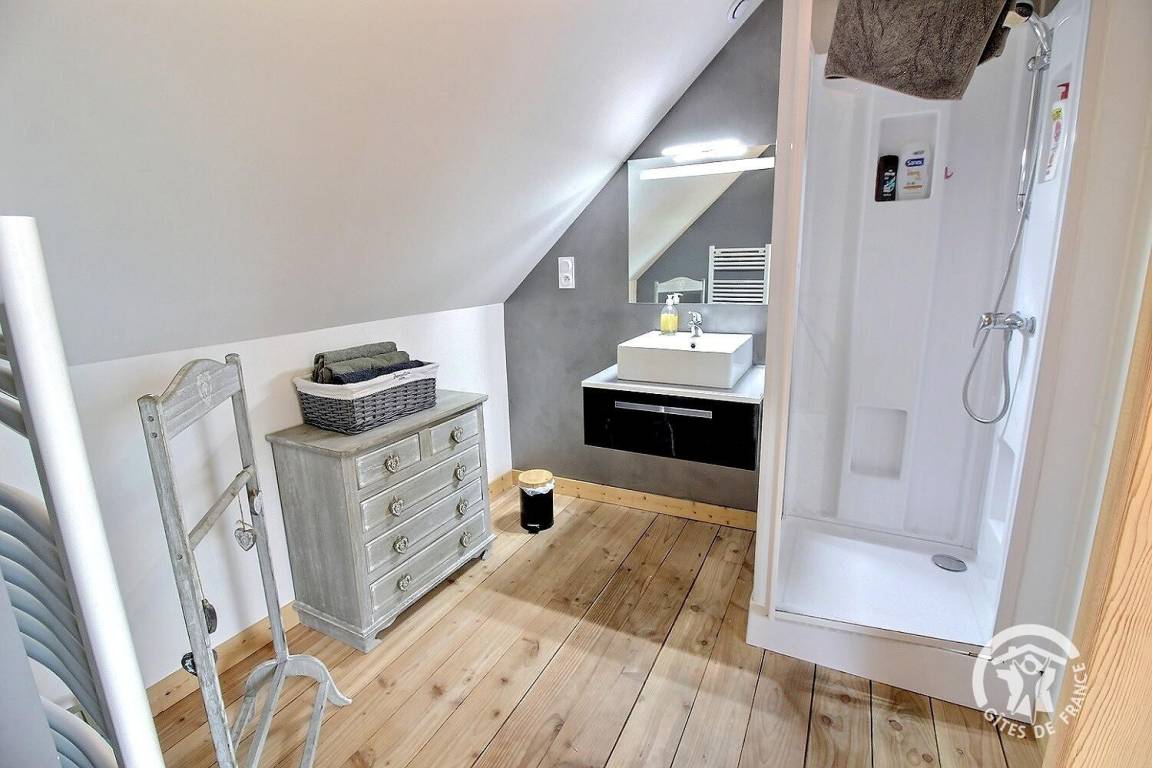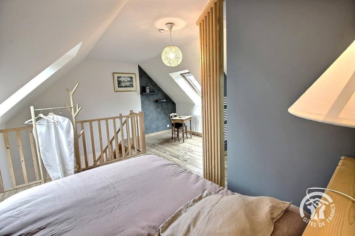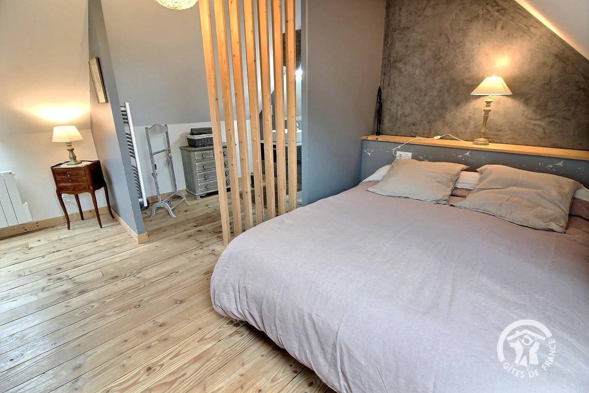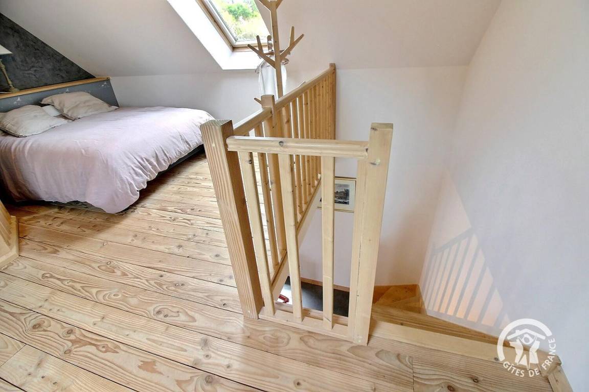 1 großes Schlafzimmer im Zwischengeschoss bietet ein Kingsize-Bett 160 x 200 (Bettwäsche wird bereitgestellt und das Bett ist bei Ankunft bezogen) und ein Badezimmer mit Dusche, das zum Schlafzimmer hin offen ist.