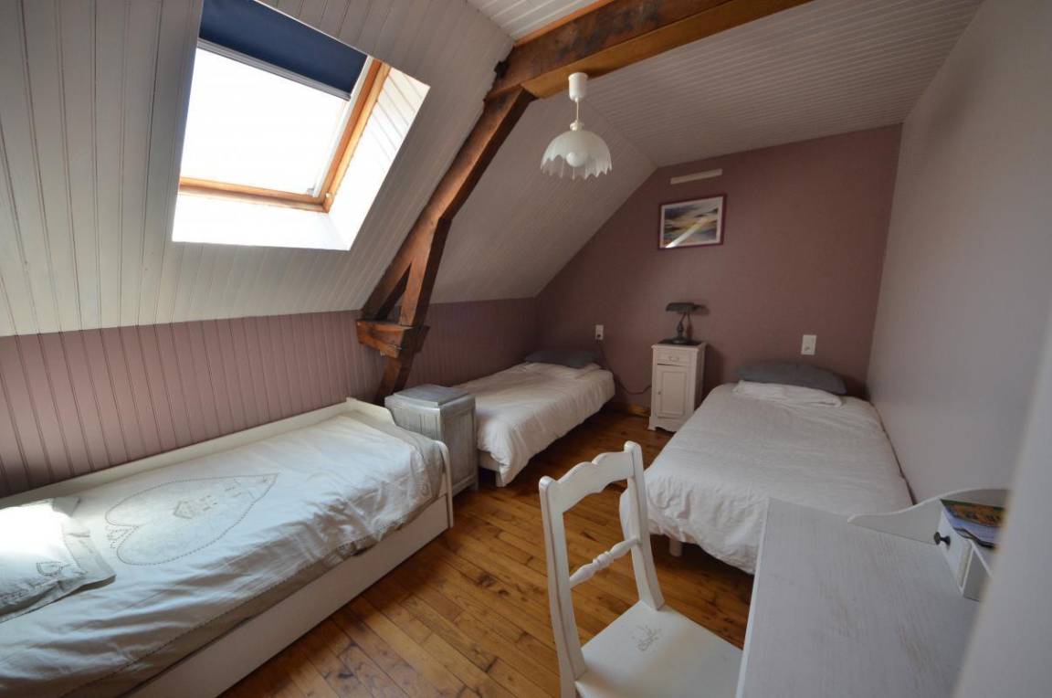 Im Obergeschoss: ein Schlafzimmer mit Doppelbett (140 x 200 cm), ein Schlafzimmer mit drei Einzelbetten (90 x 190 cm), ein Badezimmer und ein separates WC.
