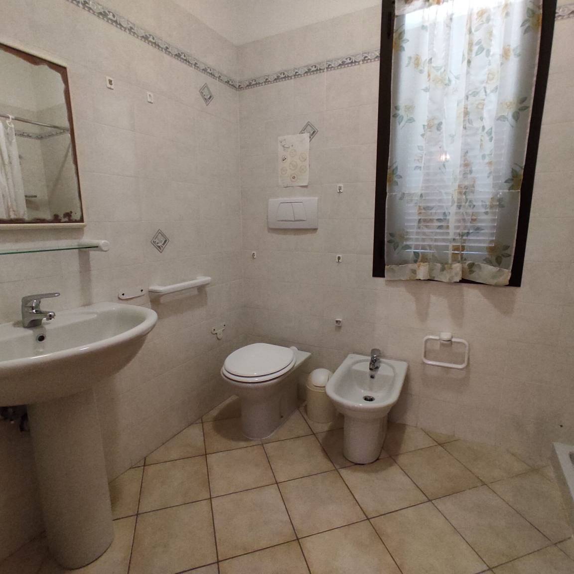 Badezimmer: Waschbecken, WC, Bidet, Dusche.