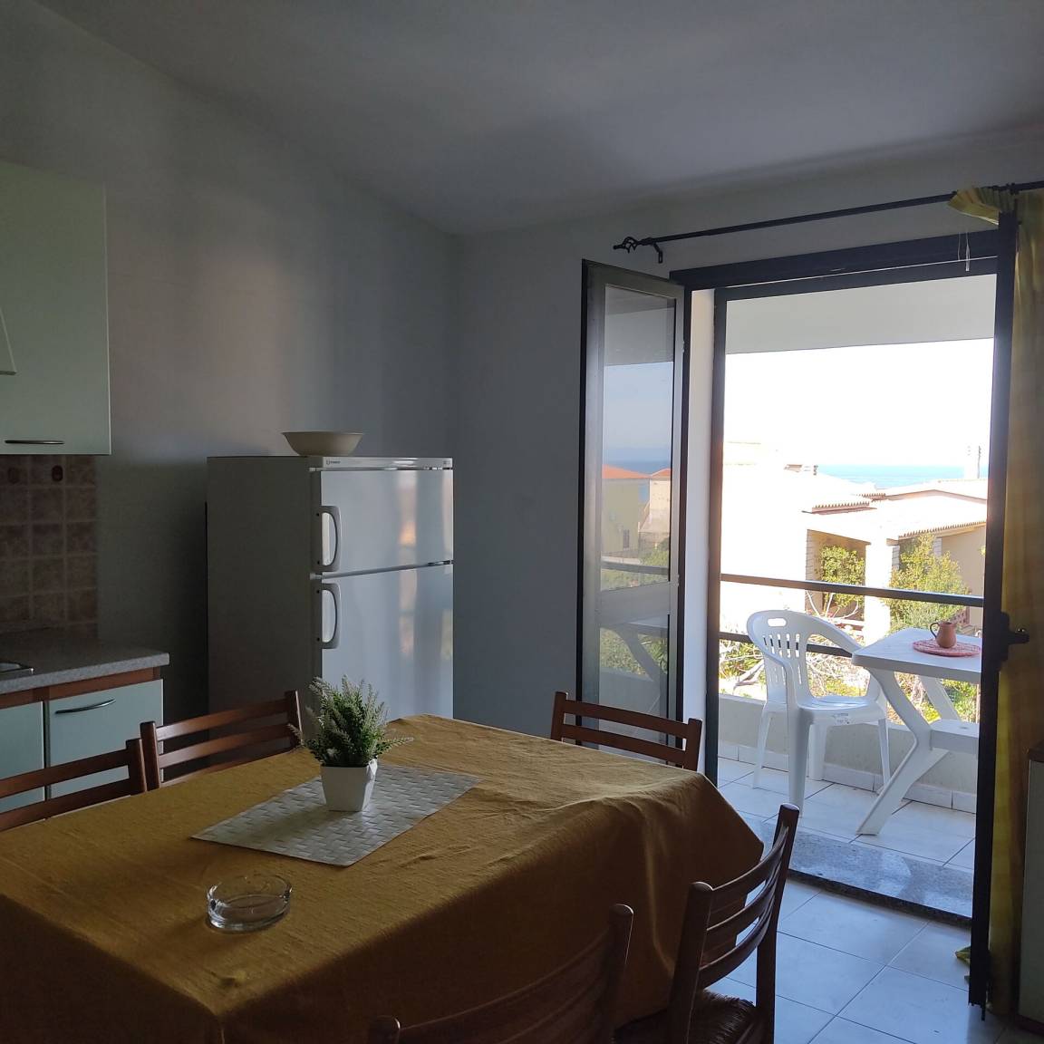 Wohnküche: Esstisch, Kühlschrank, Tiefkühler, Herd, Doppel-Schlafsofa, TV, Ausgang auf den Balkon.