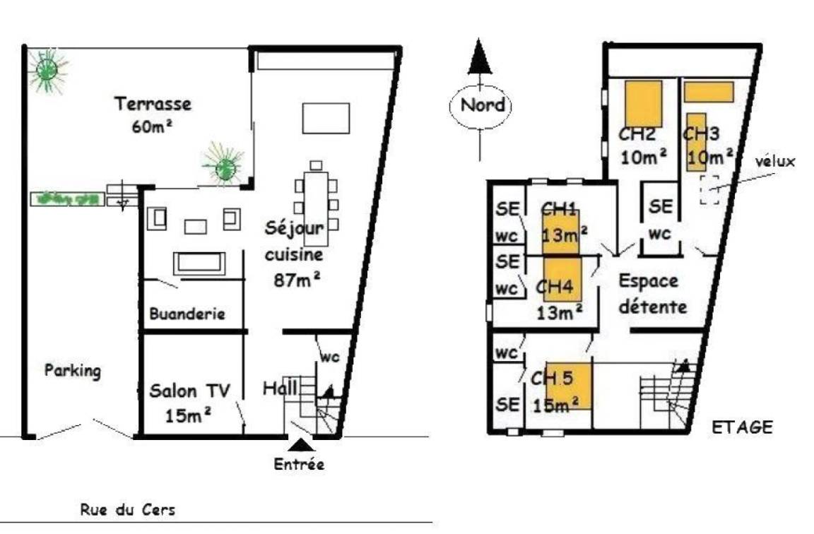 Ferienhaus bestehend aus: Wohnzimmer mit Küche und Lounge auf der Terrasse, Fernsehraum, wc. Waschküche mit SL. Im Obergeschoss, 5 CH mit 2 Zimmer mit Verbindungstür, 4 SE und 4 WC neben CH, 4lits 2 p und 2 Betten 1 p. Auserwählten und Heizung Ofen Pellet (zusätzlich). Garten und Plancha.