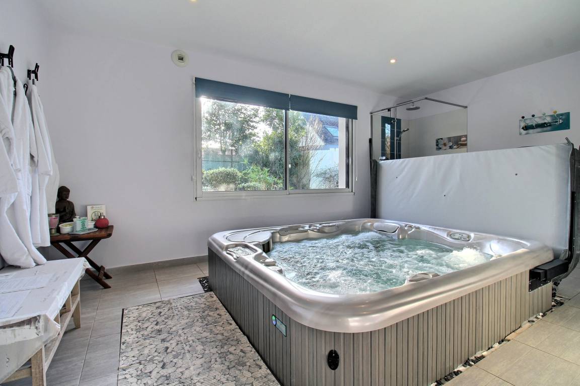 In diesem Haus können zwei befreundete Familien einen Wellness-Urlaub genießen. Ideale Lage nur 3 Autominuten von dem langen Sandstrand von Kerleven und von der Marina entfernt. Geschäfte und Golfplatz sind auch in unmittelbarer Nähe. Hotelähnliche Leistungen.