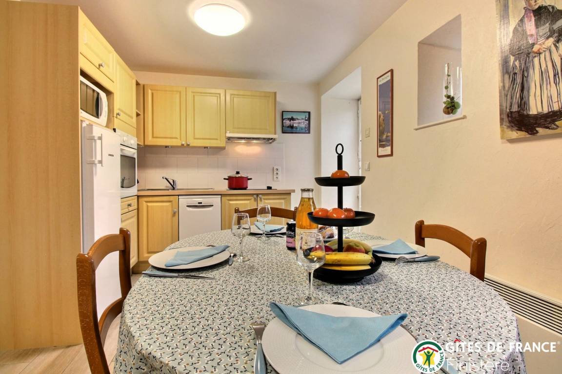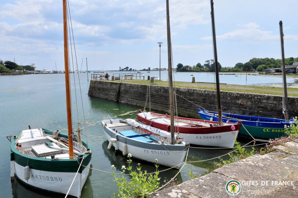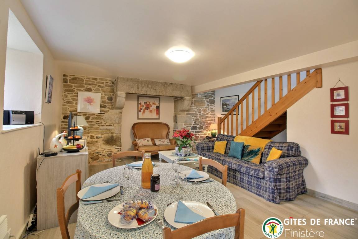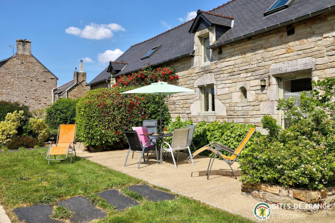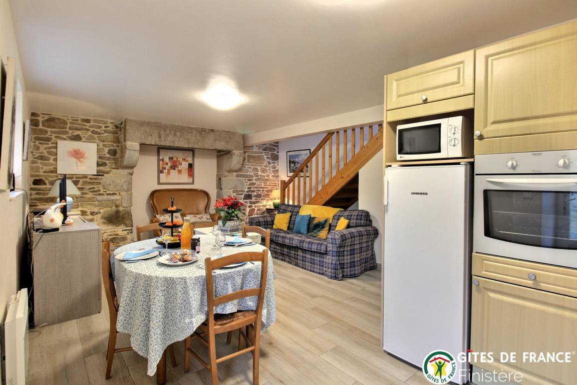 Ländliches, lang gestrecktes Anwesen mit 4 Gîtes zwischen Concarneau und Bénodet (Thalassozentrum) / dieses Reihenhaus grenzt an einen anderen Gîte. EG: Küche/Wohn-/Esszimmer mit TV (DVD Laufwerk), WC. 1. Stock: Doppelzimmer mit Bettbreite 1,60m, Zweibettzimmer, Bad. E-Heizung. Wi-Fi. Waschmaschine und Trockner in einem Nebengebäude. Eigene Terrasse, Gartenmöbel, Grill. Überdachter Platz. Tischtennisplatte, Tischfußball, Kinderspielplatz. Wiesengrundstück. Hof.
