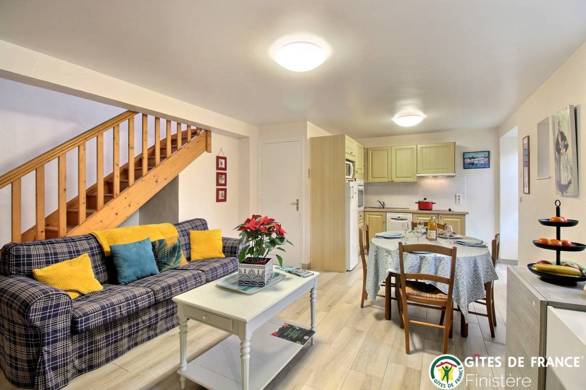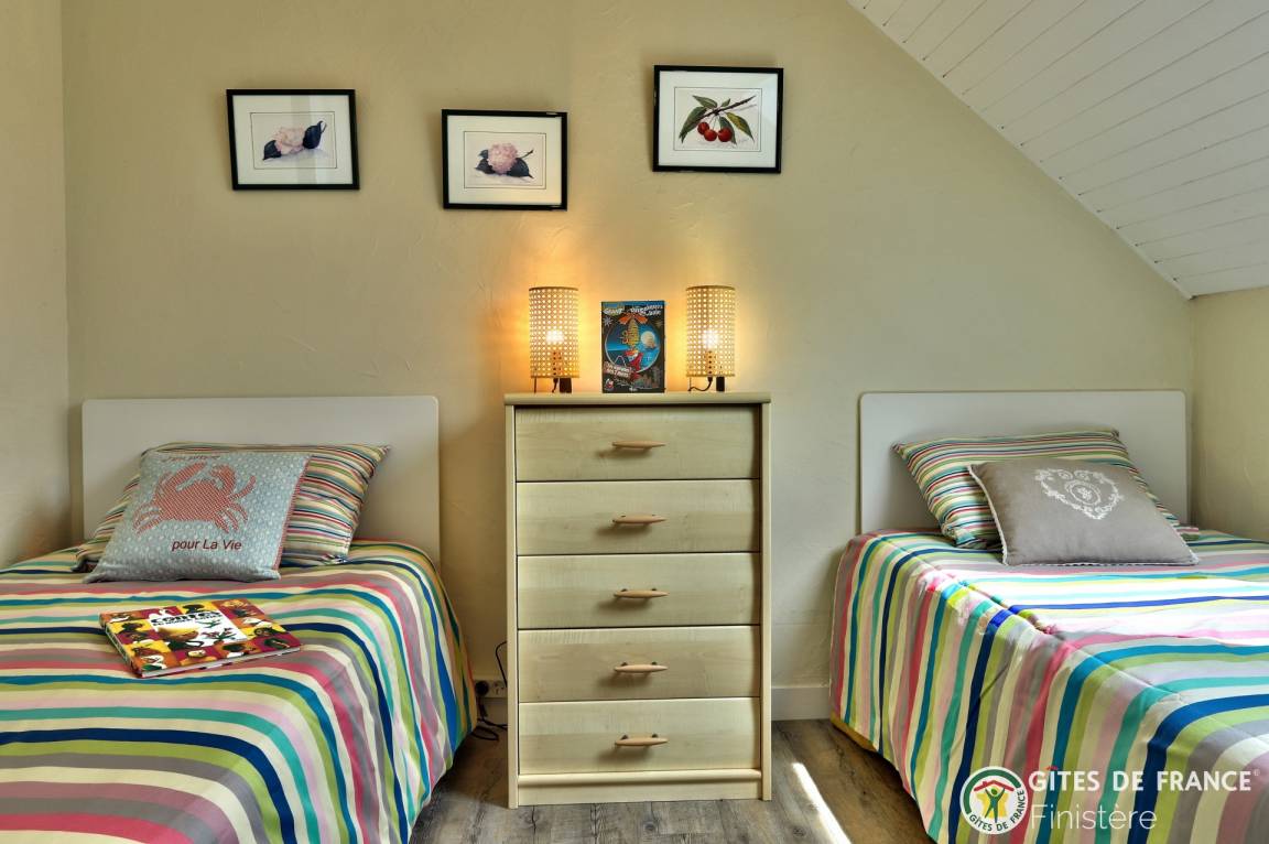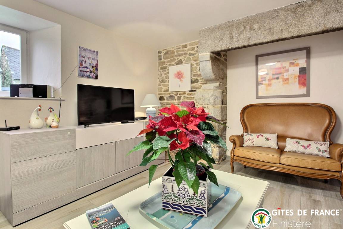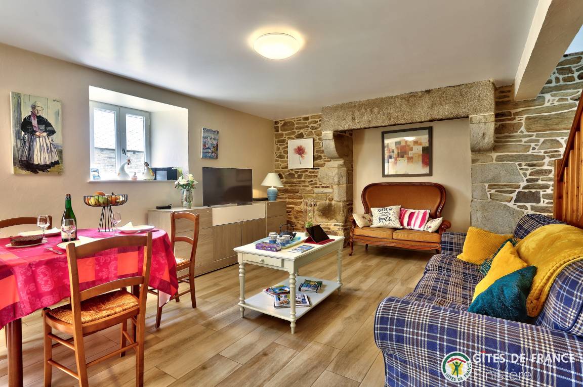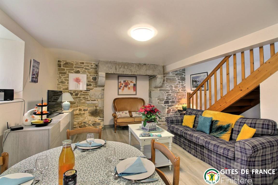 Ländliches, lang gestrecktes Anwesen mit 4 Gîtes zwischen Concarneau und Bénodet (Thalassozentrum) / dieses Reihenhaus grenzt an einen anderen Gîte. EG: Küche/Wohn-/Esszimmer mit TV (DVD Laufwerk), WC. 1. Stock: Doppelzimmer mit Bettbreite 1,60m, Zweibettzimmer, Bad. E-Heizung. Wi-Fi. Waschmaschine und Trockner in einem Nebengebäude. Eigene Terrasse, Gartenmöbel, Grill. Überdachter Platz. Tischtennisplatte, Tischfußball, Kinderspielplatz. Wiesengrundstück. Hof.