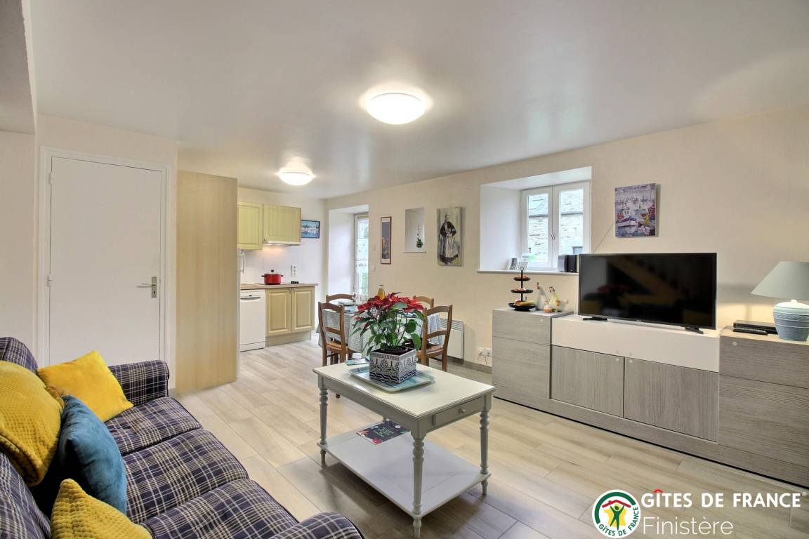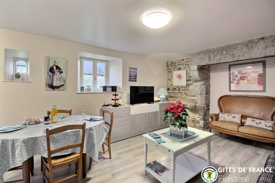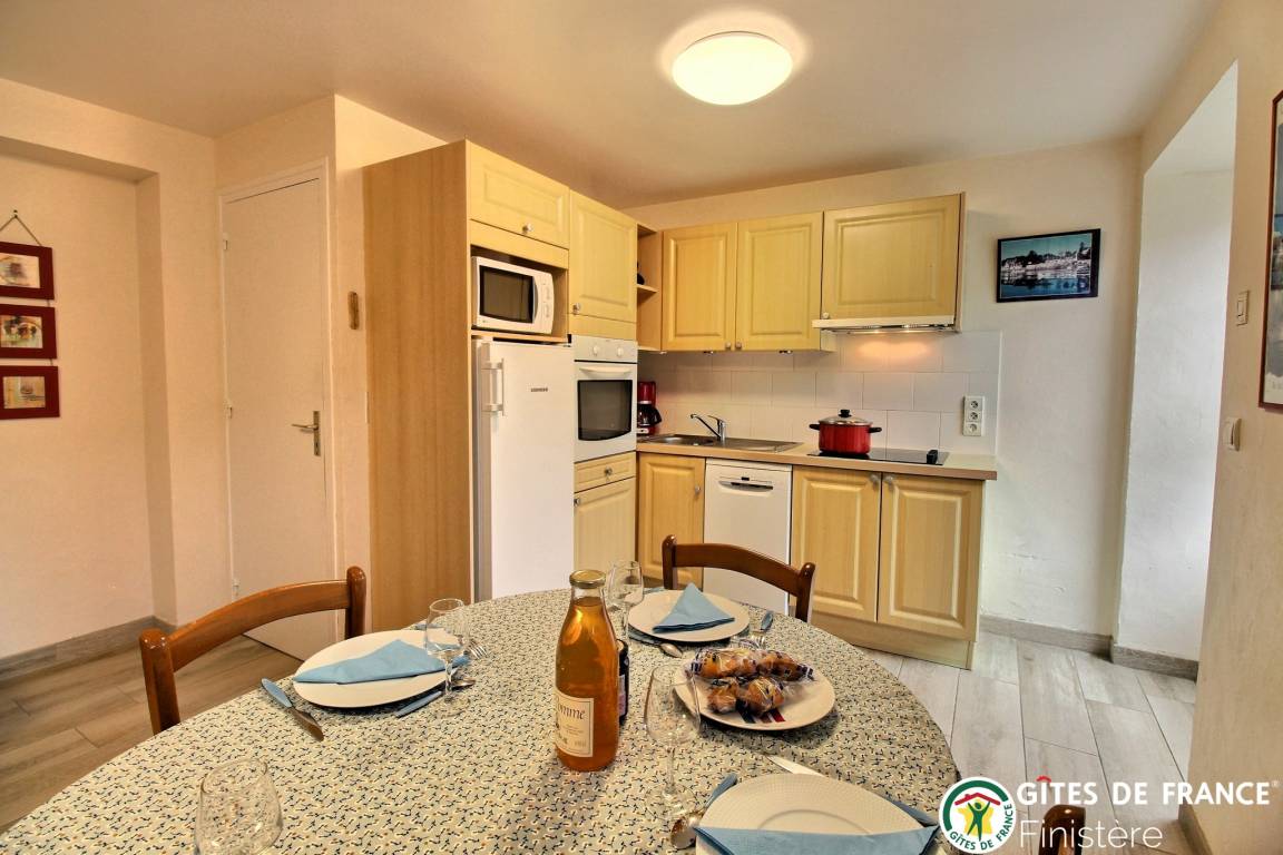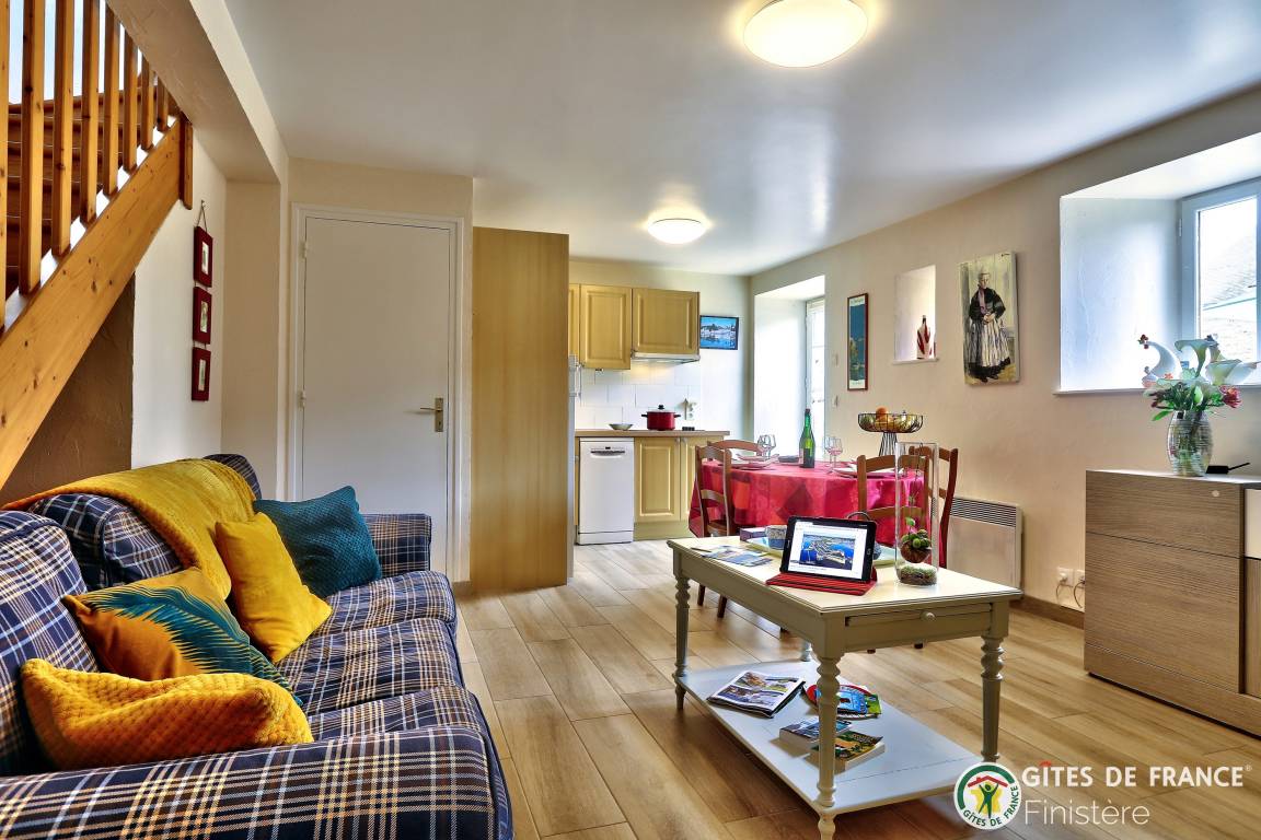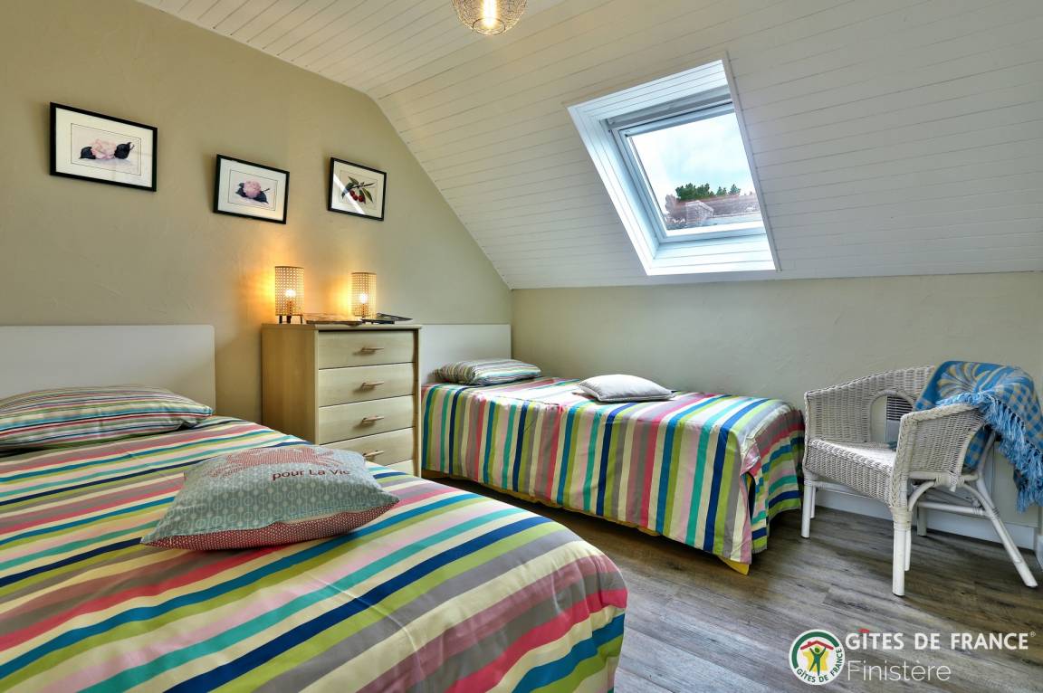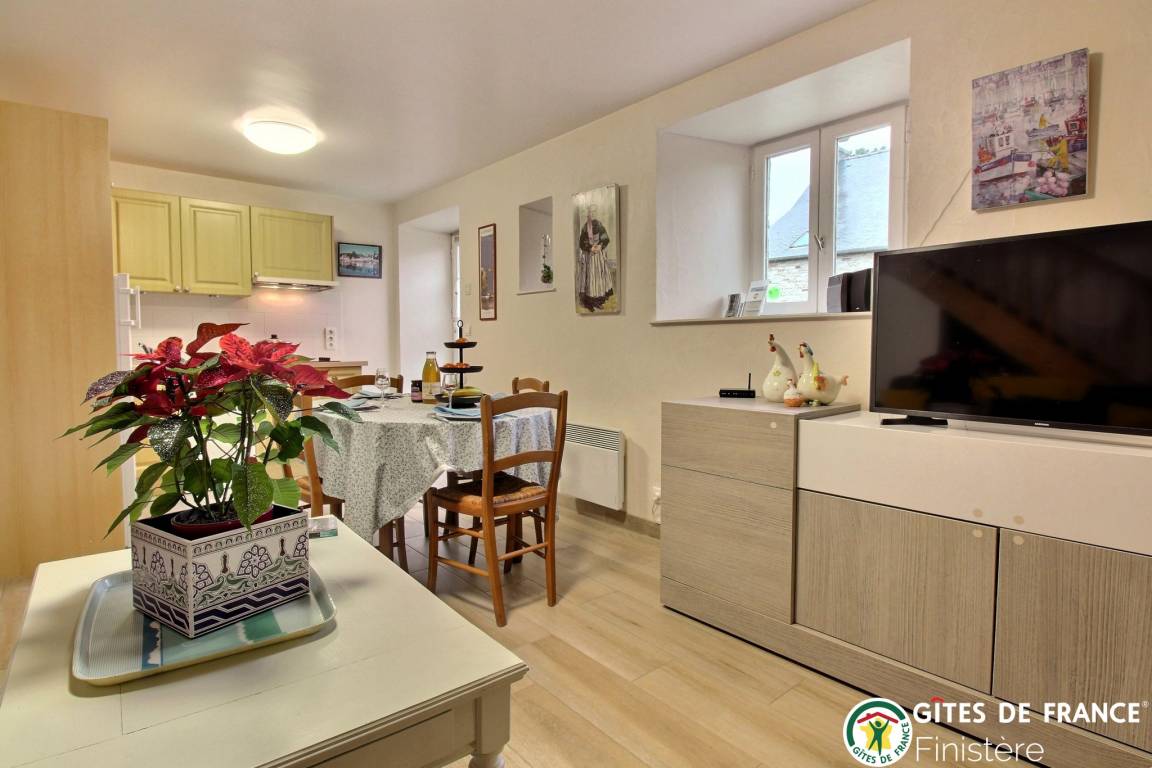 Ländliches, lang gestrecktes Anwesen mit 4 Gîtes zwischen Concarneau und Bénodet (Thalassozentrum) / dieses Reihenhaus grenzt an einen anderen Gîte. EG: Küche/Wohn-/Esszimmer mit TV (DVD Laufwerk), WC. 1. Stock: Doppelzimmer mit Bettbreite 1,60m, Zweibettzimmer, Bad. E-Heizung. Wi-Fi. Waschmaschine und Trockner in einem Nebengebäude. Eigene Terrasse, Gartenmöbel, Grill. Überdachter Platz. Tischtennisplatte, Tischfußball, Kinderspielplatz. Wiesengrundstück. Hof.