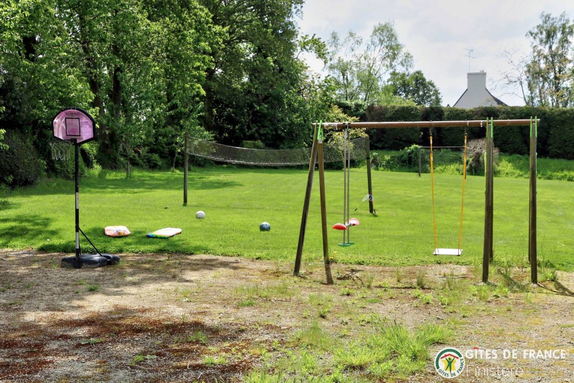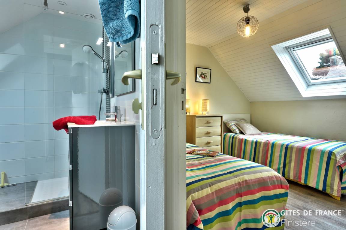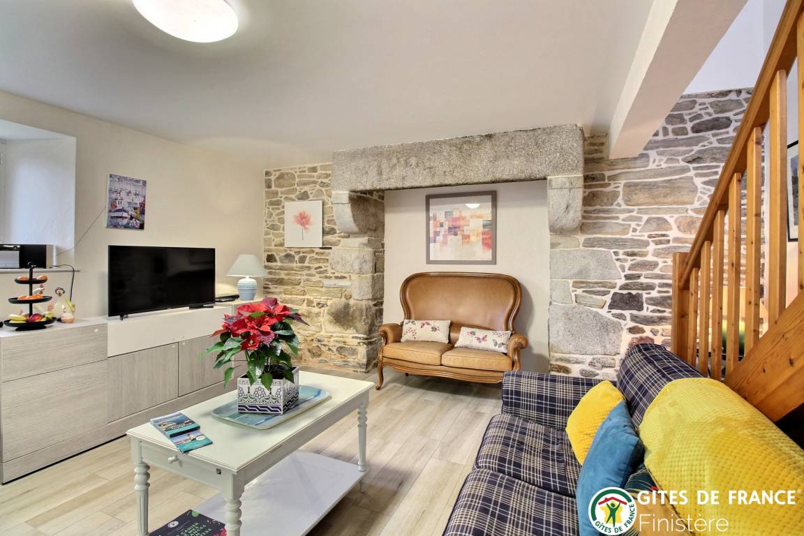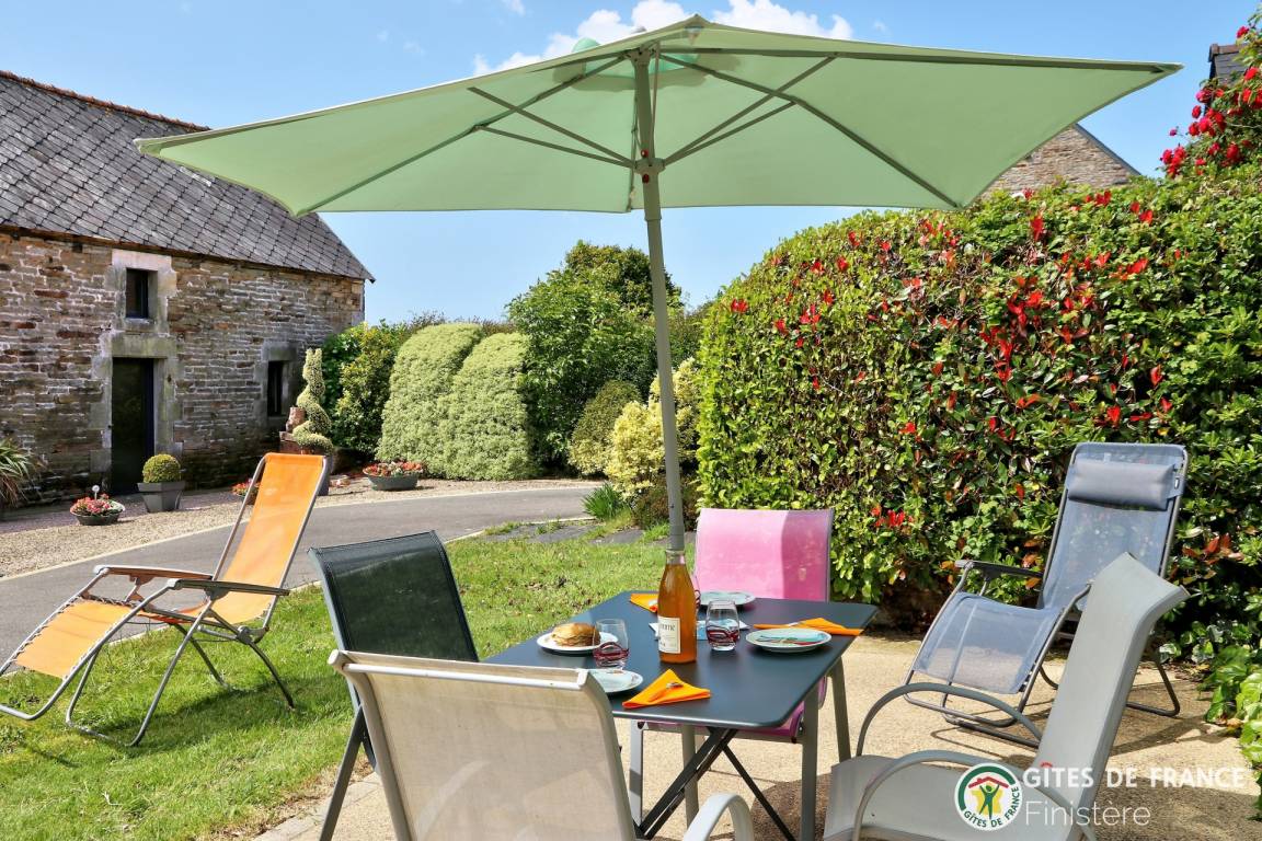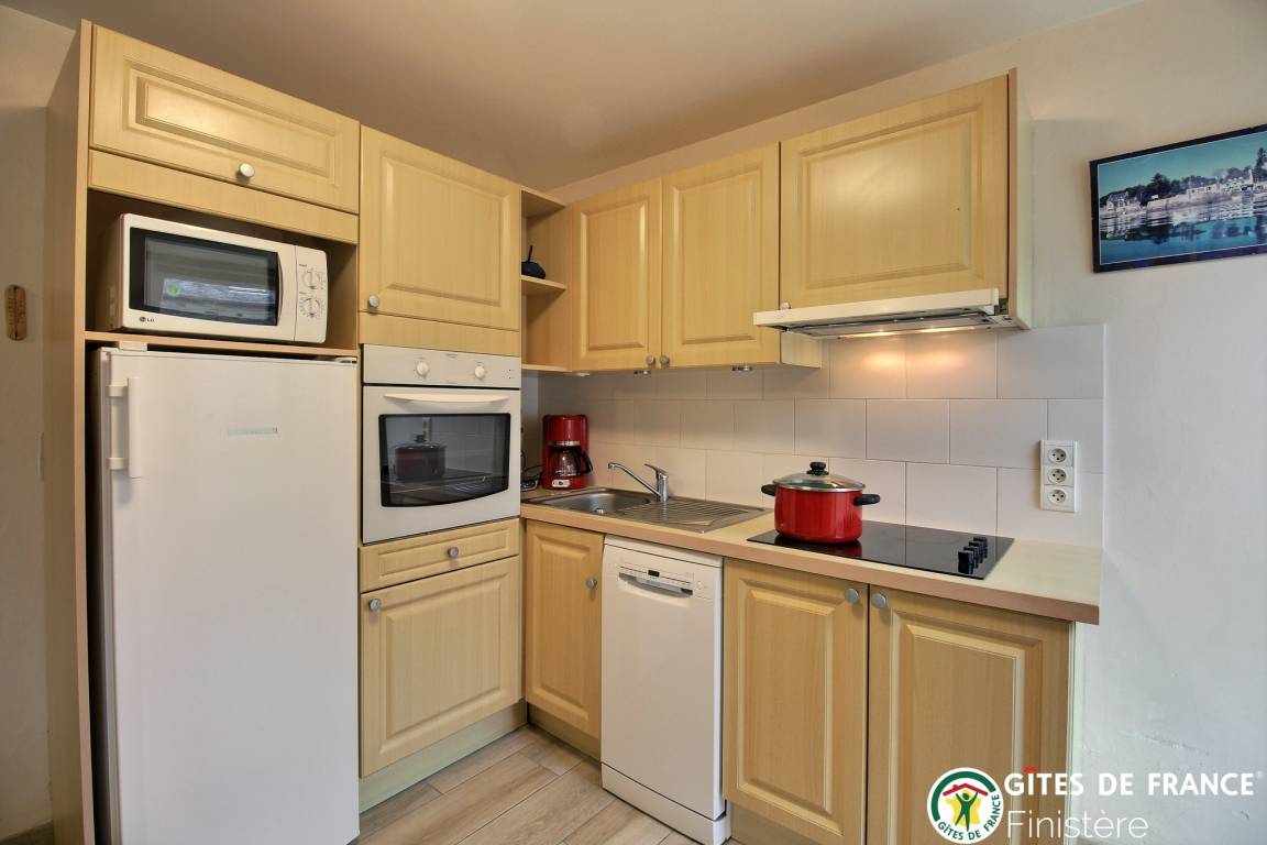 Ländliches, lang gestrecktes Anwesen mit 4 Gîtes zwischen Concarneau und Bénodet (Thalassozentrum) / dieses Reihenhaus grenzt an einen anderen Gîte. EG: Küche/Wohn-/Esszimmer mit TV (DVD Laufwerk), WC. 1. Stock: Doppelzimmer mit Bettbreite 1,60m, Zweibettzimmer, Bad. E-Heizung. Wi-Fi. Waschmaschine und Trockner in einem Nebengebäude. Eigene Terrasse, Gartenmöbel, Grill. Überdachter Platz. Tischtennisplatte, Tischfußball, Kinderspielplatz. Wiesengrundstück. Hof.