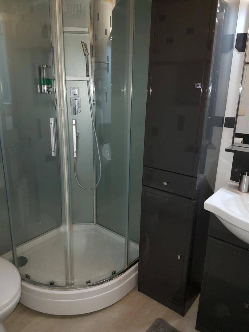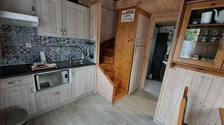 Erdgeschoss: Voll ausgestattete Küche mit Essbereich. Badezimmer mit Dusche und WC, ein Schlafzimmer mit einem Doppelbett (140 cm).