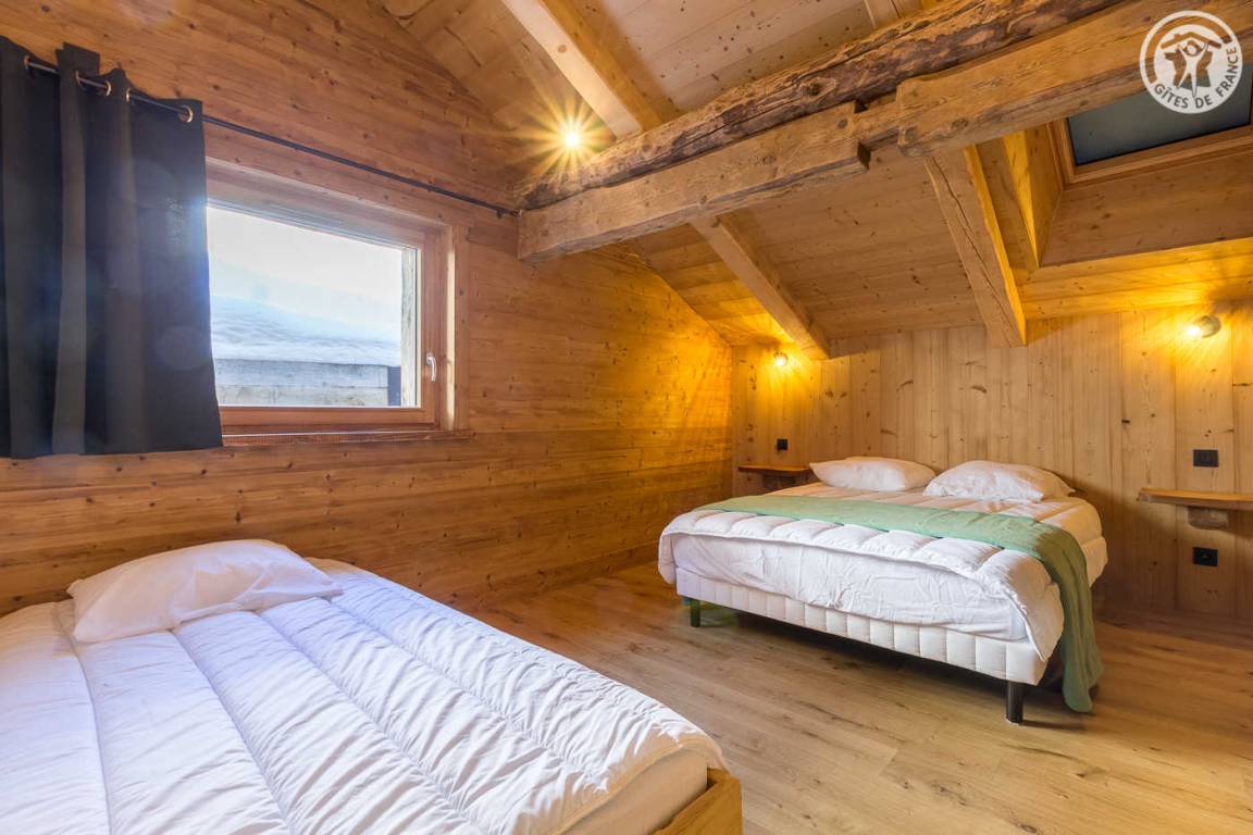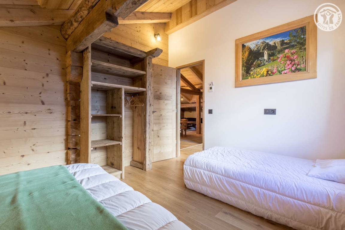 Individuelles Chalet auf 2 Ebenen. Erdgeschoss: 2 Schlafzimmer (1 Doppelbett 160x200 cm / 2 Einzelbetten 90x190 cm), 1 Schlafzimmer mit Duschbad (Dusche - 1 Doppelbett 160x200 cm), Duschbad (Dusche), WC, Waschküche, Skiraum. 1. Stock: Wohnzimmer-Küche, 3 Schlafzimmer (1 Einzelbett 90 x 190 cm / 2 Einzelbetten 90 x 190 cm / 1 Doppelbett 140 x 190 cm + 1 Einzelbett 90 x 190 cm), Badezimmer (Badewanne + Dusche), WC, Balkon. Grundstück, Privatparkplatz (Pflichtausrüstung im Winter). Telefon- und Internetnetz laut Betreiber eingeschränkt.