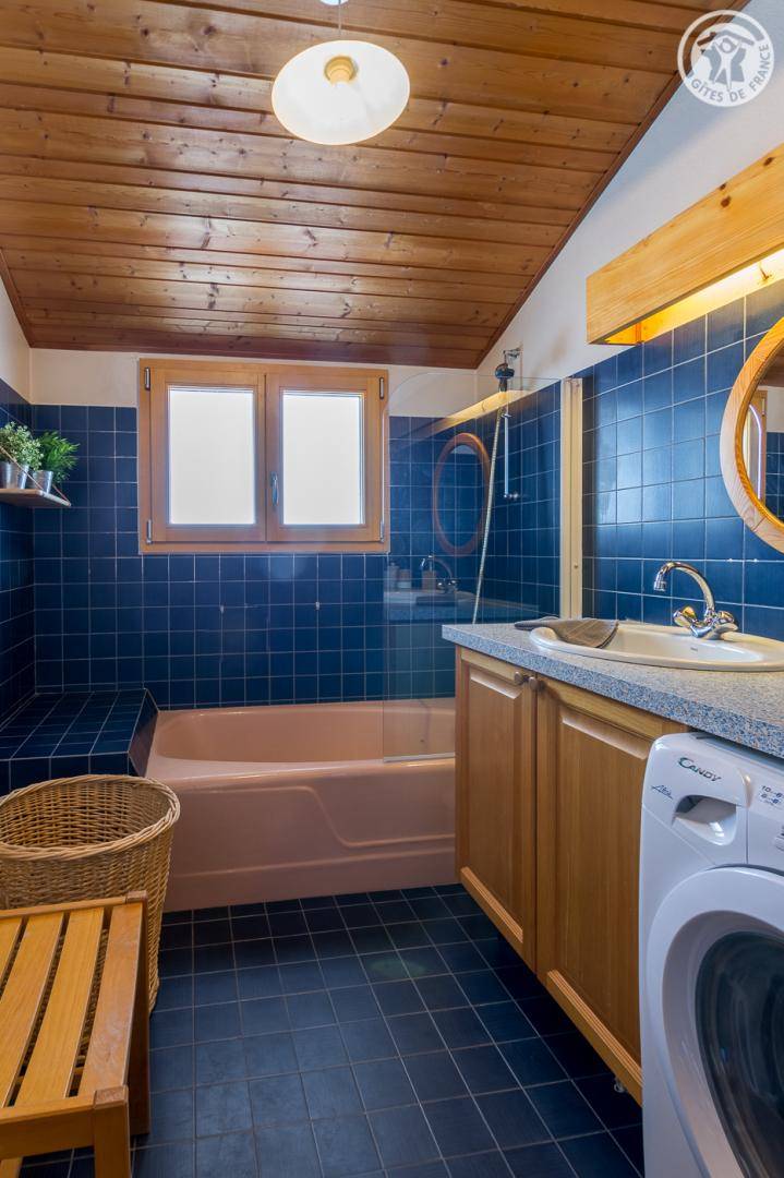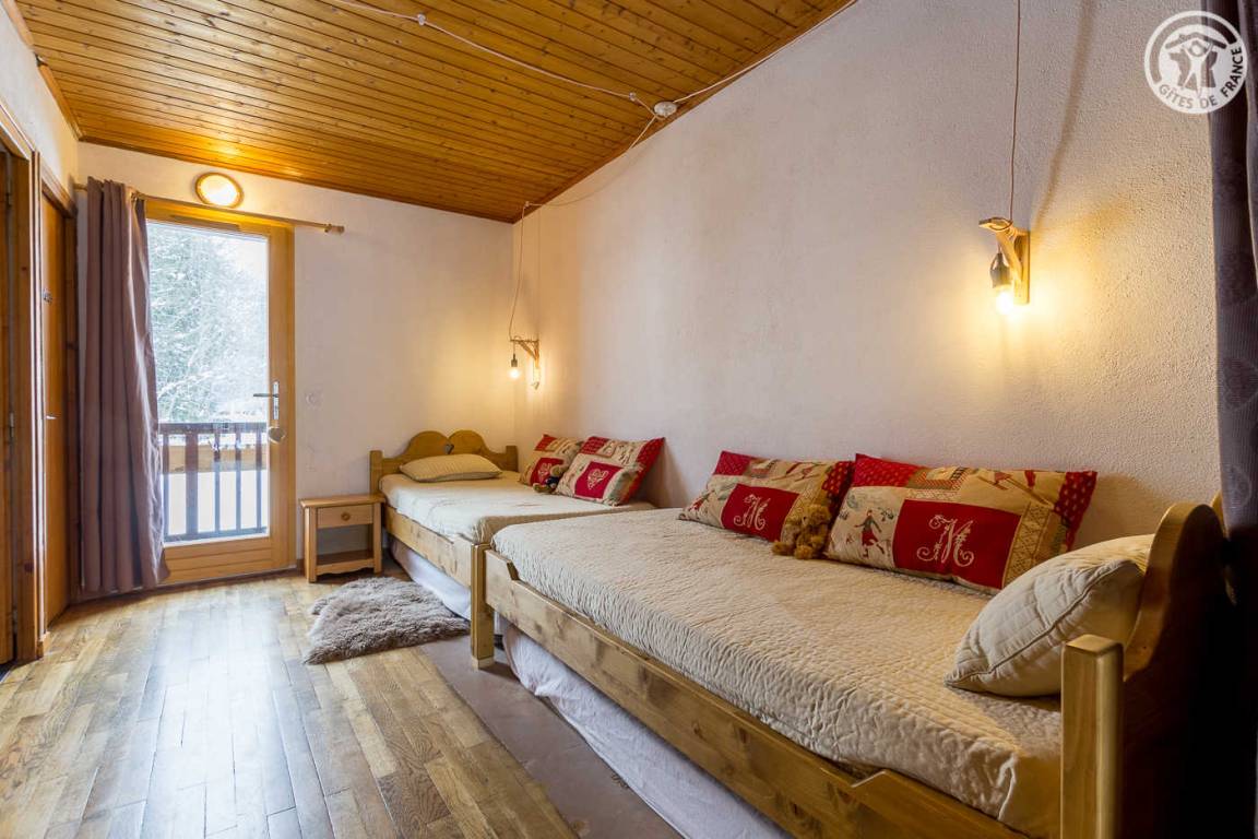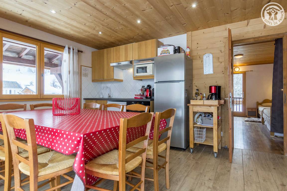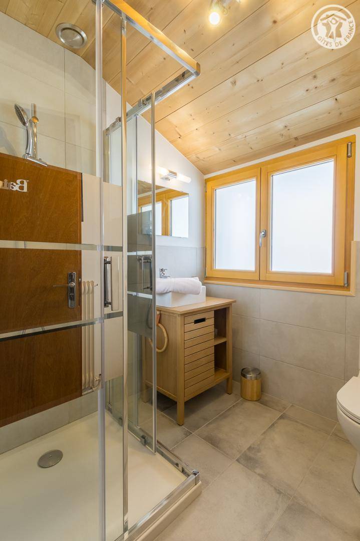 Chalet bestehend aus 3 Gites. Ferienhaus im 1. Stock (Zugang über eine unabhängige Innentreppe). Wohnzimmer-Küche mit Sitzecke. 3 Schlafzimmer (1 Doppelbett 140 x 190 cm/1 Doppelbett 140 x 190 cm/1 Doppelbett 140 x 190 cm) und eine Schlafnische mit 4 Einzelbetten (4 Einzelbetten 90 x 190 cm). 1 Badezimmer (Badewanne) und 1 Duschraum (Dusche und WC), separates WC. Südbalkon. Privater Skiraum. Telefon- und Internetnetz laut Betreiber eingeschränkt.