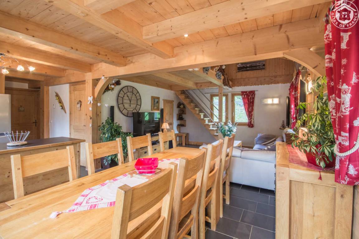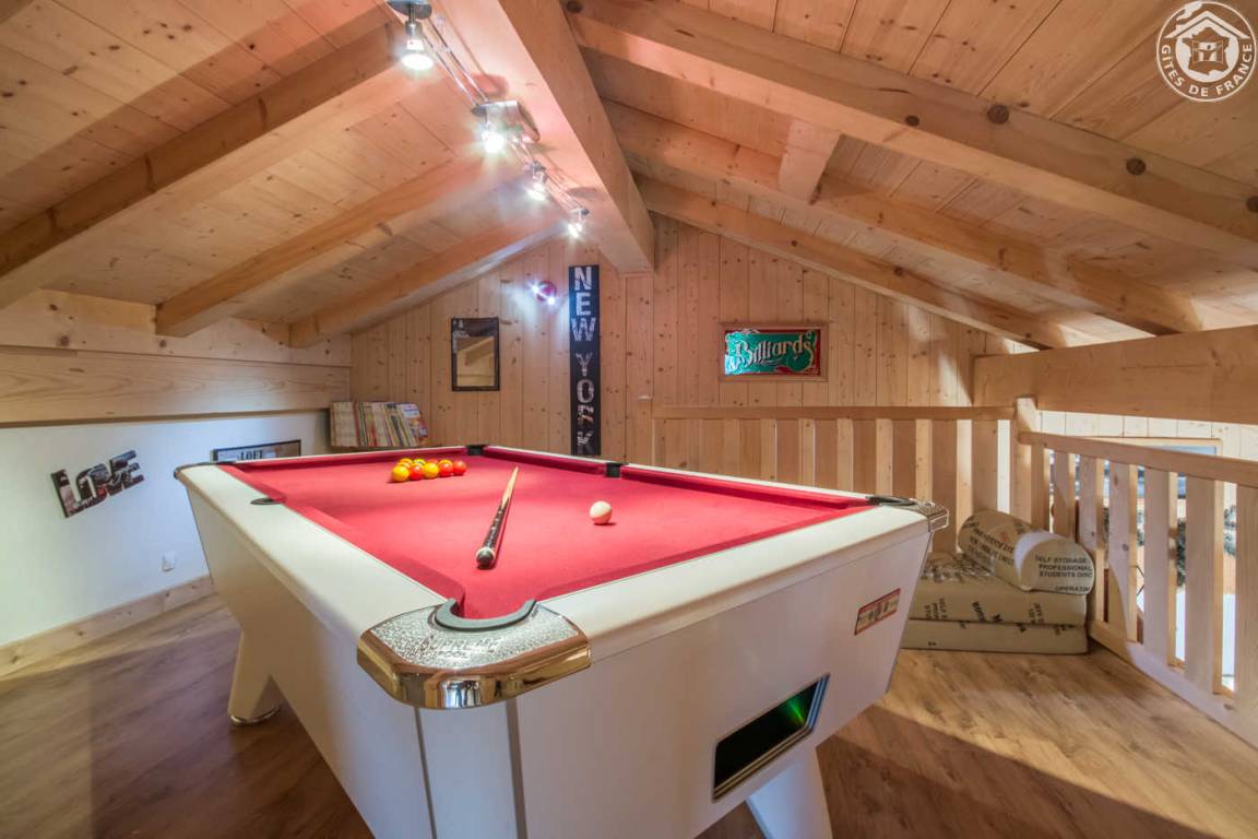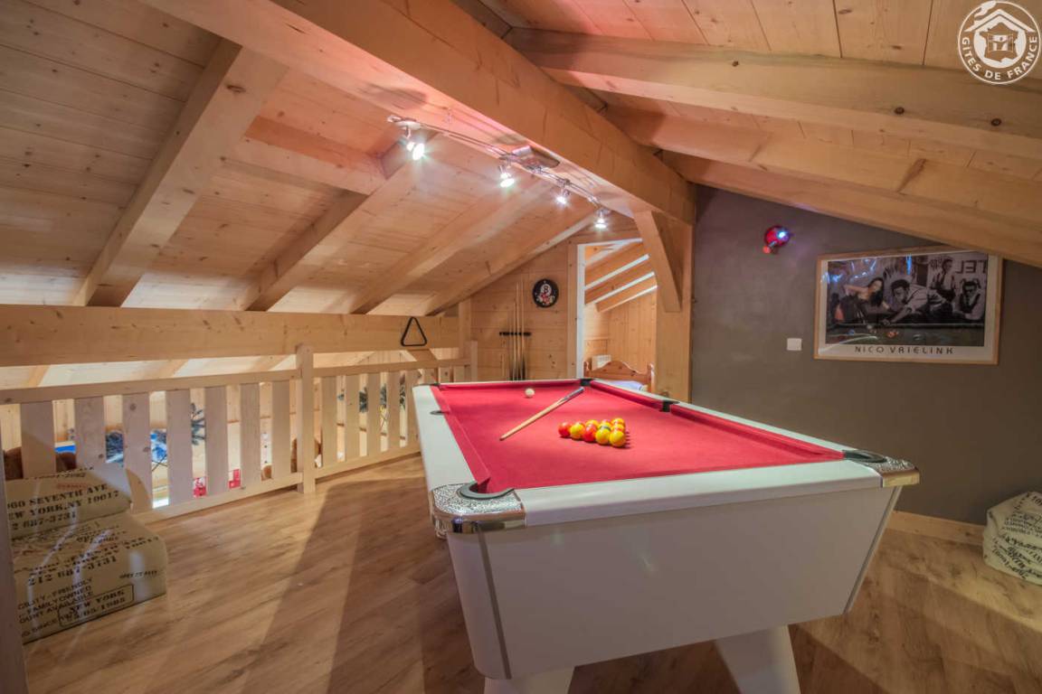 Unabhängiges Chalet. Erdgeschoss + 1. + 2. Stock: Wohnzimmer-Küche-Lounge, Home-Cinema, 1 Schlafzimmer mit Multi-Jet-Dusche und TV (1 Doppelbett), 3 Schlafzimmer (1 Doppelbett / 1 Doppelbett 160 x 200 cm, 1 Einzelbett / 1 Doppelbett 160 x 200 cm), Mezzanine mit Billardtisch, Badezimmer (Multi-Jet-Dusche + Badewanne), 2 separate WCs. Balkon-Terrasse + Garten. Spa draußen unter Schutz. Bettwäsche und Handtücher inklusive. Betten bei Ankunft bezogen. Reinigung inbegriffen. Ski La Giettaz Portes du Mt-Blanc 4 km, Flumet/Espace Diamant 9 km. Sonntag / Sonntagsmiete.