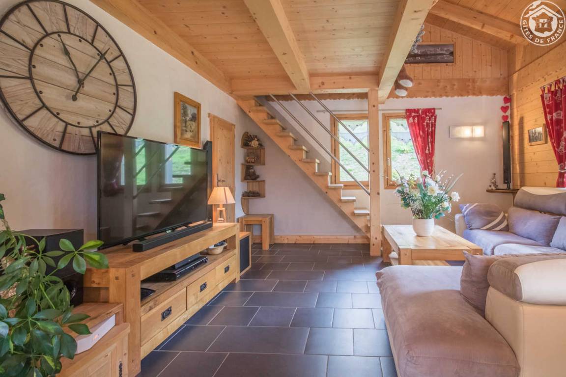„Accueil très chaleureux de la propriétaire, venue plus tôt à notre demande, chalet conforme au descriptif. L'emplacement est fabuleux, le panorama est magnifique de quelque côté du chalet. Un petit bémol concernant le livret d'accueil qui est très succinct et dont l'accès wifi n'est mentionné qu'en anglais ! et sur lequel nous aurions aimé trouver des idées de balades à proximité. Une autre remarque, concernant le mobilier de salon qui est très, très bas et donc extrêmement inconfortable pour des personnes de nos ages - 74 et 83 ans -. Ceci ne remet absolument pas en cause le confort du chalet pour les jeunes et moins jeunes, mais pose problème aux personnes comme nous, "les encore moins jeunes" qui n'avons pas pu profiter pleinement de nos soirées télé.“