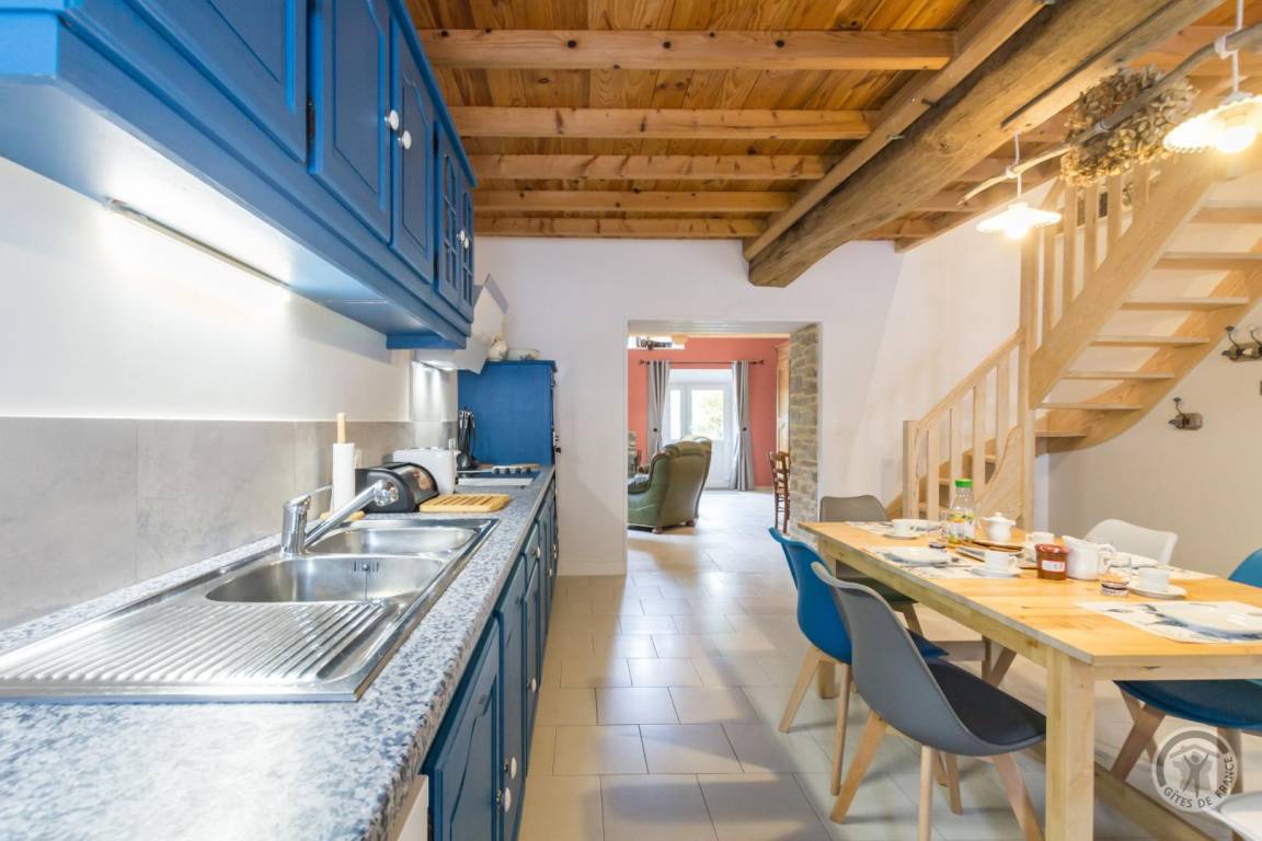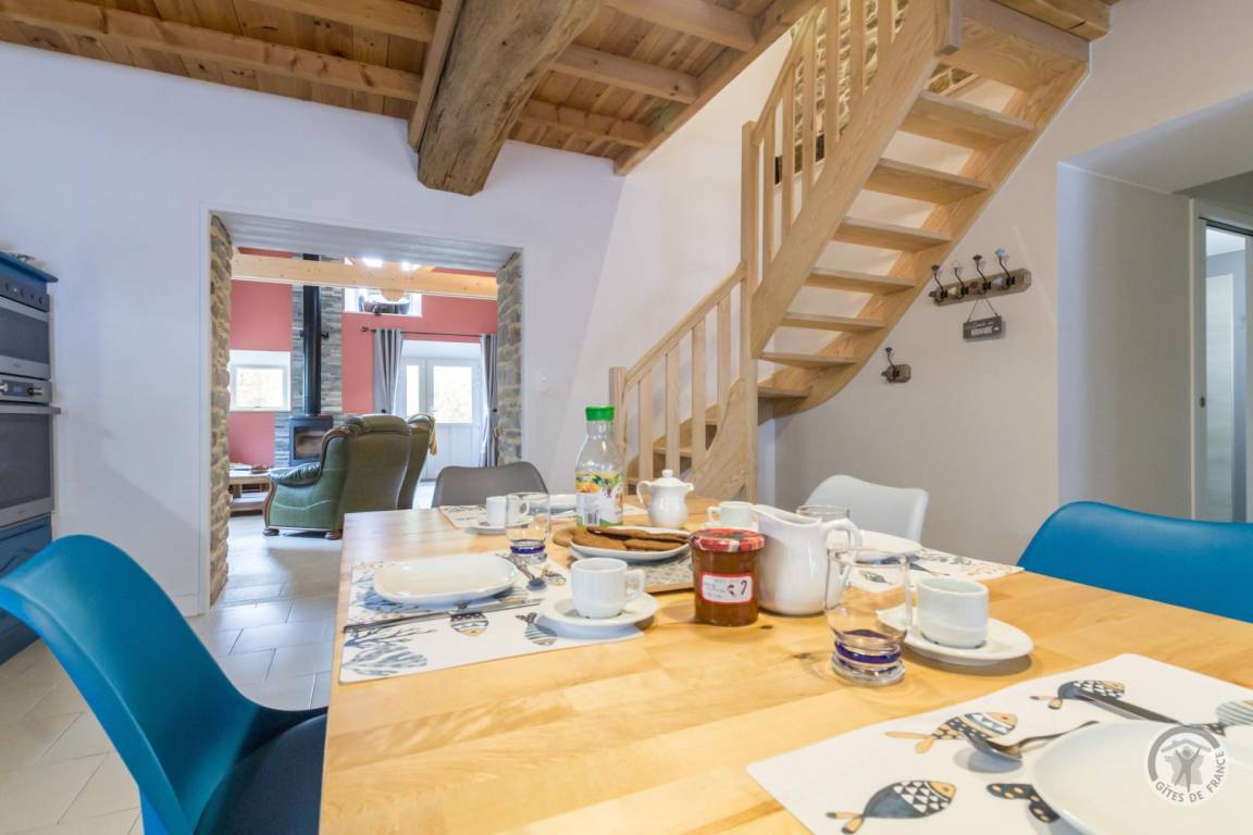 Freistehendes Haus. Offene Küche/Wohnzimmer (Backofen, Kühlschrank mit Gefrierfach, Geschirrspüler, Mikrowelle, Waschmaschine). Wohnzimmer mit Kaminofen (TV, Glasfaser-Internet). Duschbad mit WC. Schlafzimmer 1 (Einzelbett 90x200 cm). Im ersten Stock: Schlafzimmer 2 (Doppelbett 180x200 cm), Schlafzimmer 3 (zwei Einzelbetten 100x190 cm). WC mit Waschbecken. Babyausstattung auf Anfrage. Bettwäsche, Handtücher und Haushaltswäsche können gemietet werden. Reinigungsservice gegen Aufpreis. Elektrische Heizung inklusive.