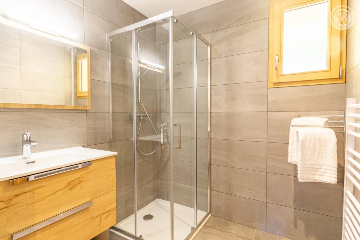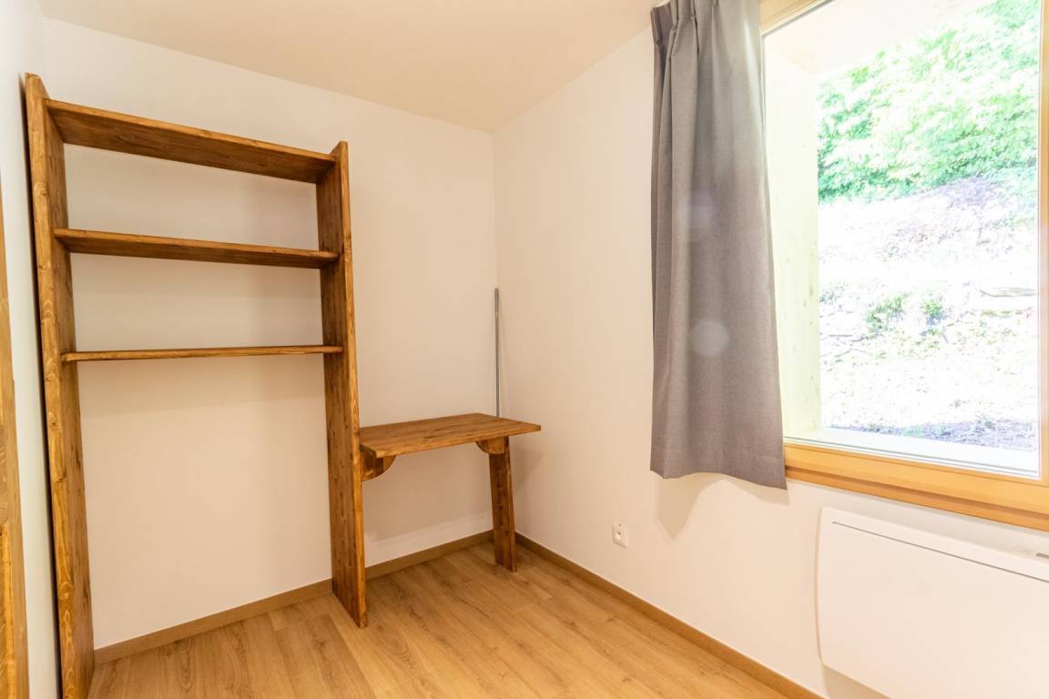 An ein anderes Ferienhaus (73G209103) angrenzendes Ferienhaus mit gemeinsamem Zugang über eine Außentreppe (7 Stufen). Hochparterre: Wohnküche mit Sitzecke, 2 Schlafzimmer (mit je 2 Einzelbetten 90x190 cm, die zu 1 Doppelbett 180x190 cm zusammengestellt werden können), 1 Schlafzimmer (2 Einzelbetten 90x190 cm), ein Badezimmer (Dusche 0,80 x 0,80 cm), separates WC. Private Terrasse. Individuelle Ladesteckdose für Elektrofahrzeuge. Gemeinsam genutztes Land. Von 3 Ferienhäusern in einem Nebengebäude gemeinsam genutzte Waschküche (Waschmaschine und Trockner).