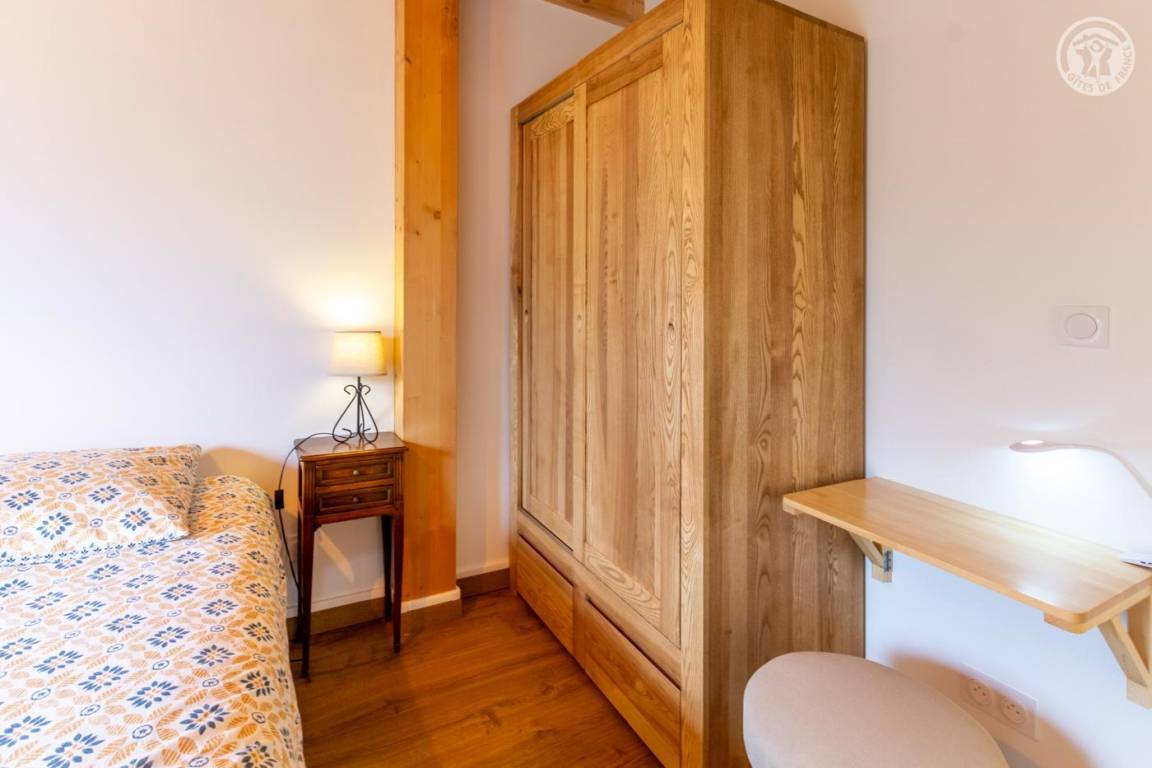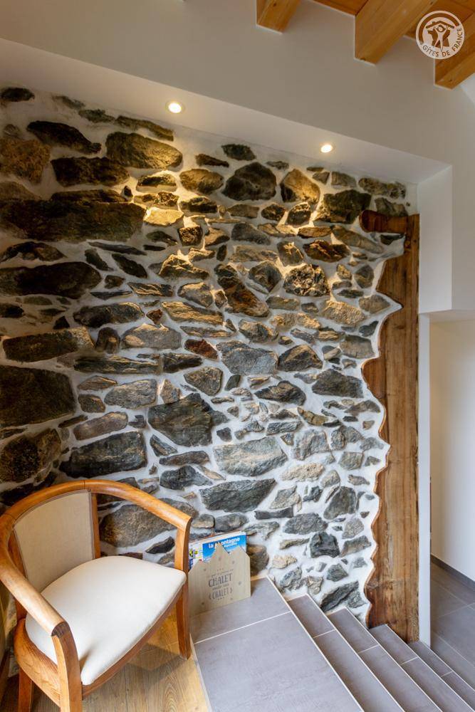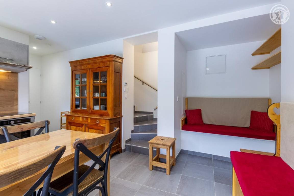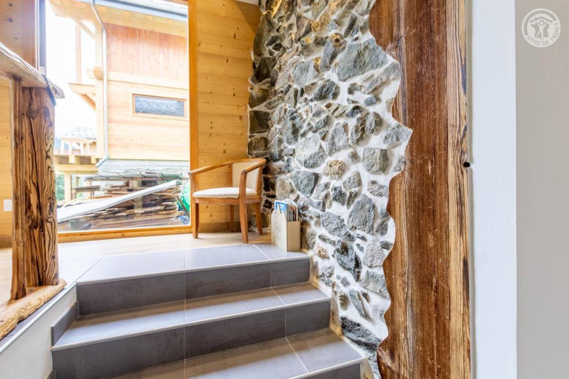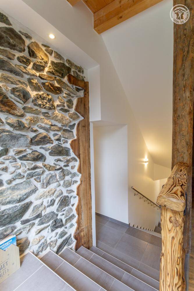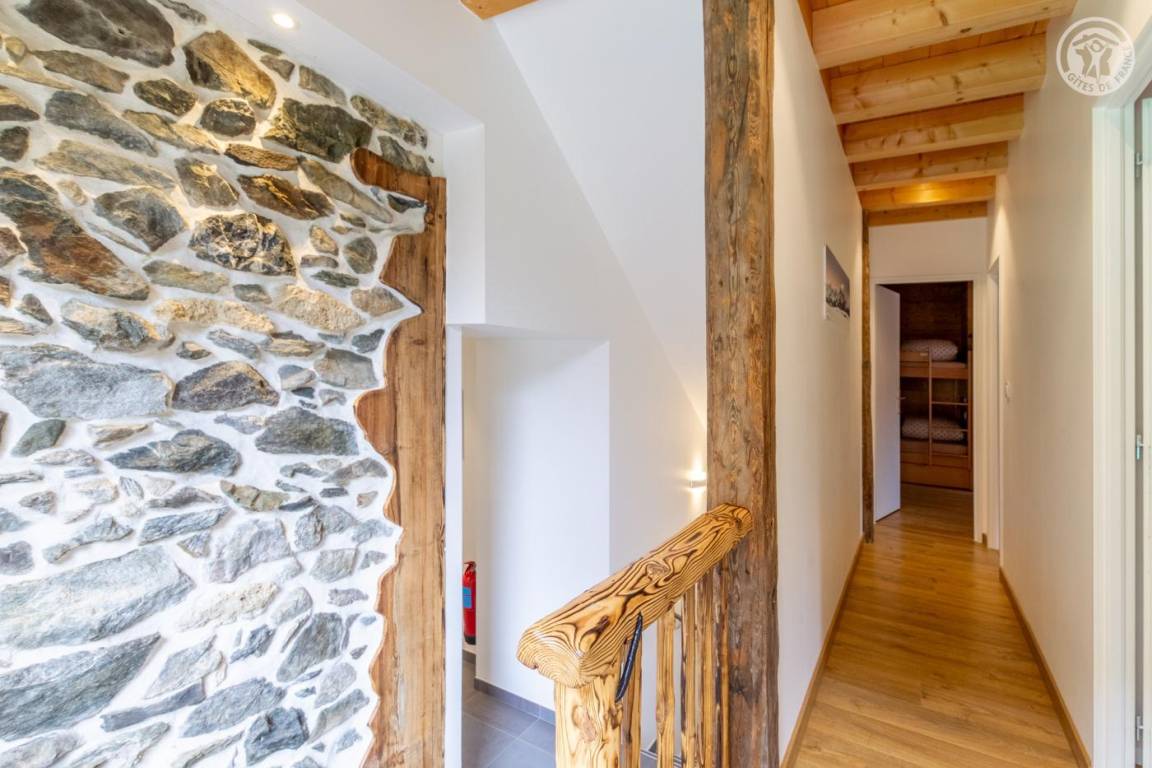 Gite auf zweieinhalb Ebenen mit Zugang von der Straße über eine Außentreppe, die zur ersten Ebene des Gite führt, einschließlich eines Eingangs, eines Skiraums und eines Schuhraums, einer kleinen Waschküche, eines Badezimmers (Badewanne) und eines Badezimmers mit Wasser ( Italienische Dusche), separates WC. Ebene 0 (Erdgeschoss): Wohnzimmer-Küchen-Loungebereich (manuell aufgeladener Pelletofen) mit Zugang zur Terrasse, Spa (3 Plätze), 2. separates WC. Ebene 1,5: 3 Schlafzimmer mit gemeinsamem Balkon (1 Doppelbett 160 x 200 cm / 1 Doppelbett 160 x 200 cm / 1 Doppelbett 160 x 200 cm, 2 Etagenbetten 90 x 190 cm).