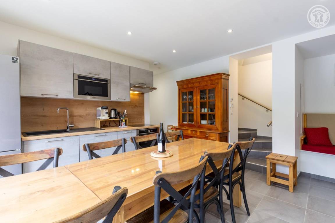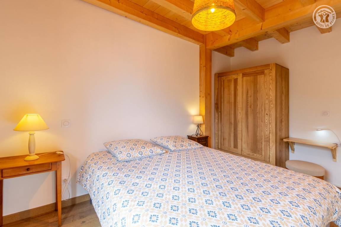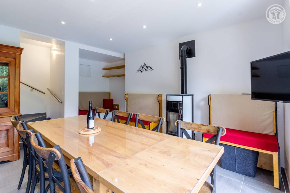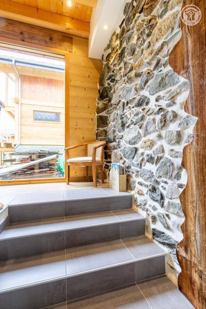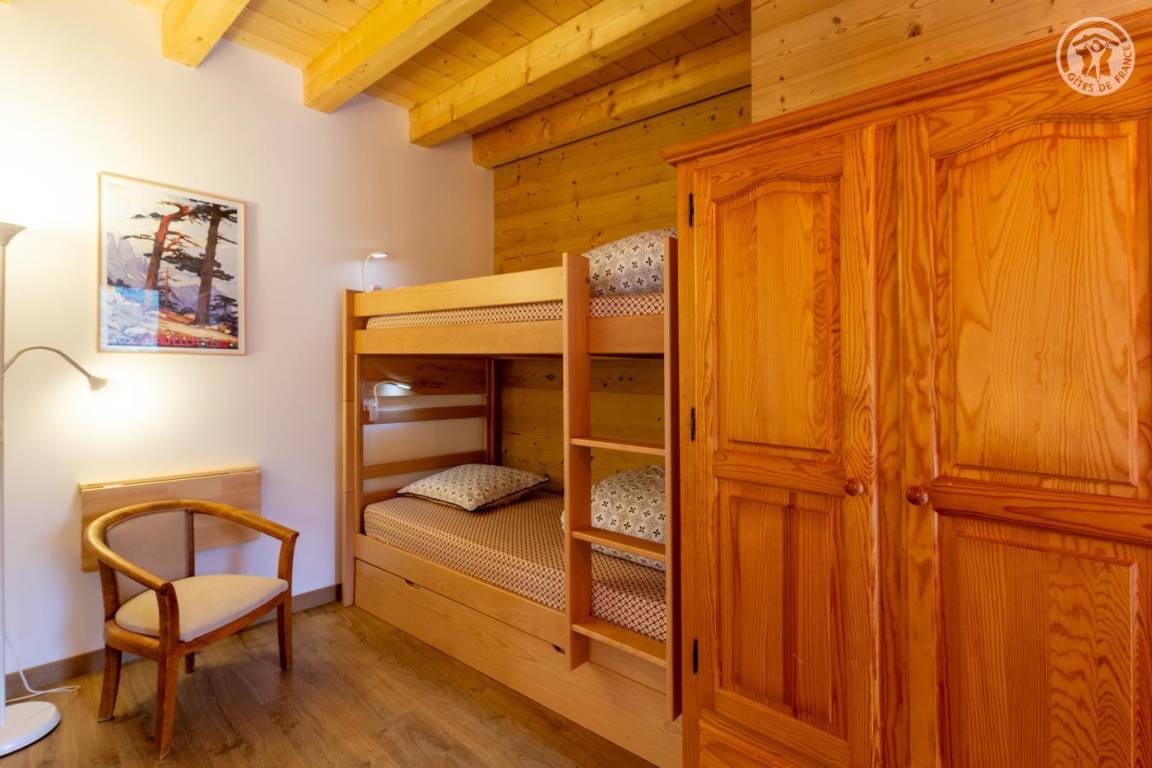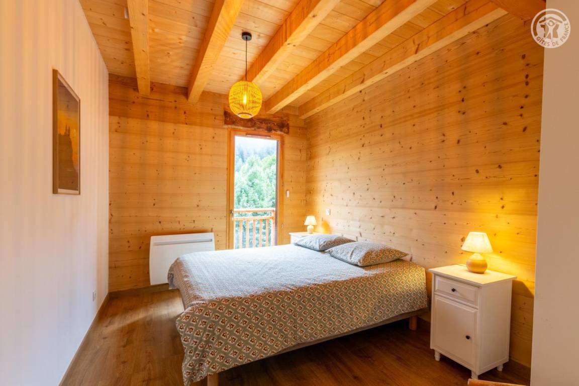 Gite auf zweieinhalb Ebenen mit Zugang von der Straße über eine Außentreppe, die zur ersten Ebene des Gite führt, einschließlich eines Eingangs, eines Skiraums und eines Schuhraums, einer kleinen Waschküche, eines Badezimmers (Badewanne) und eines Badezimmers mit Wasser ( Italienische Dusche), separates WC. Ebene 0 (Erdgeschoss): Wohnzimmer-Küchen-Loungebereich (manuell aufgeladener Pelletofen) mit Zugang zur Terrasse, Spa (3 Plätze), 2. separates WC. Ebene 1,5: 3 Schlafzimmer mit gemeinsamem Balkon (1 Doppelbett 160 x 200 cm / 1 Doppelbett 160 x 200 cm / 1 Doppelbett 160 x 200 cm, 2 Etagenbetten 90 x 190 cm).