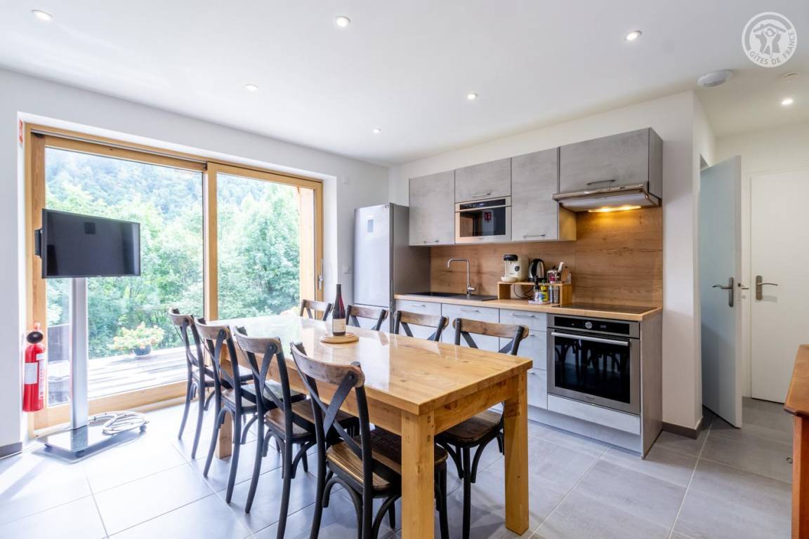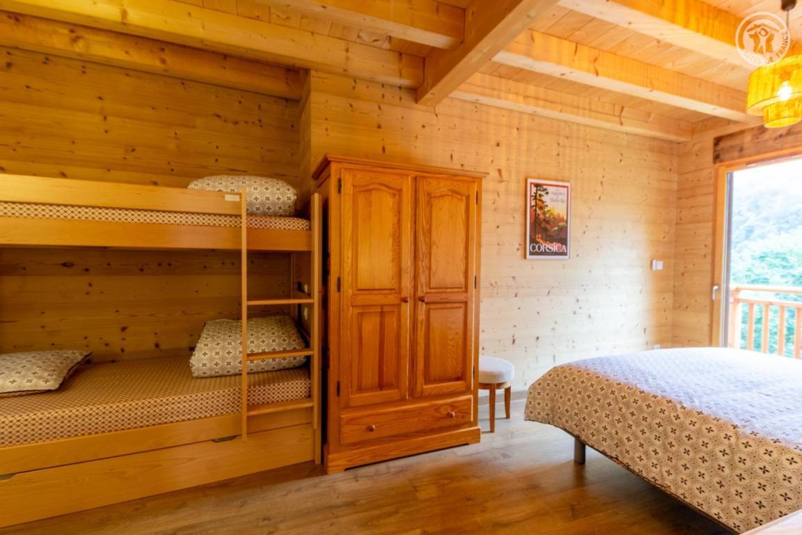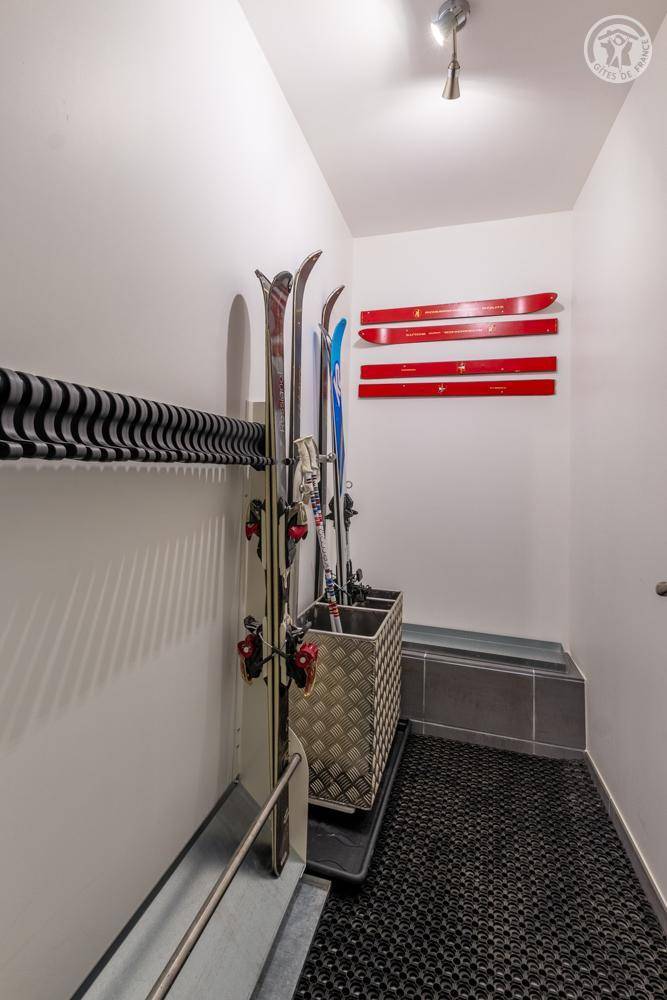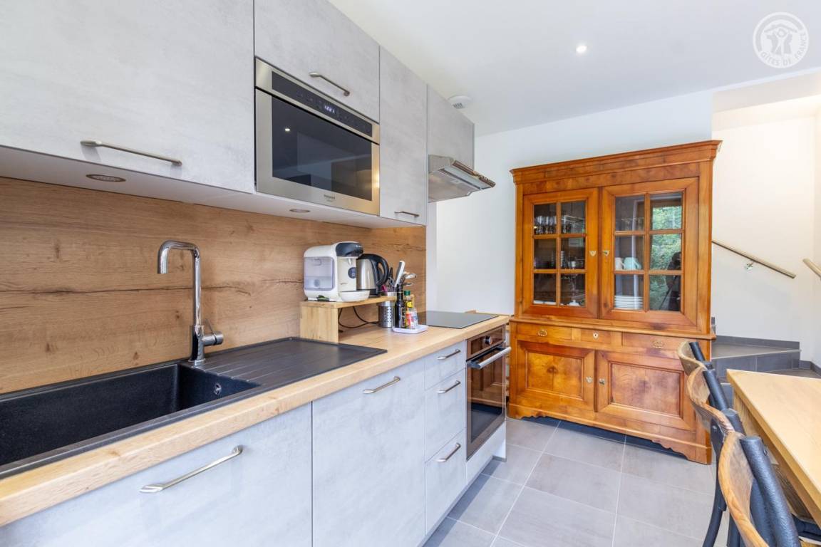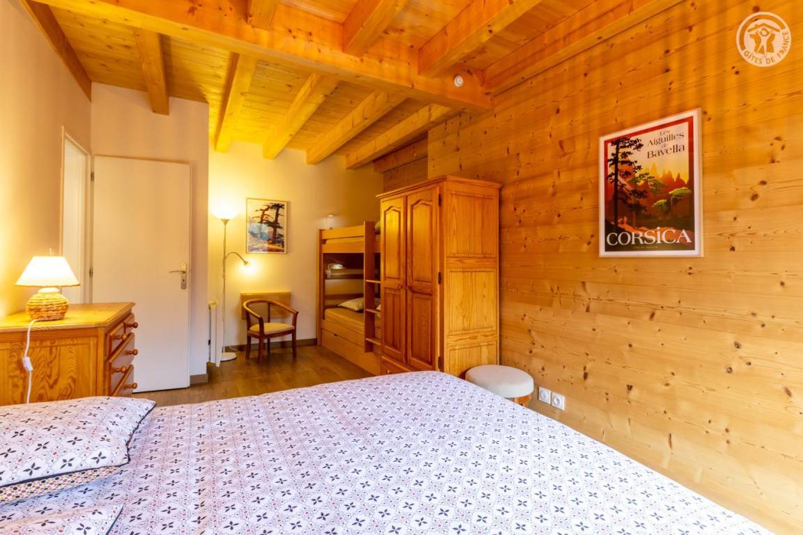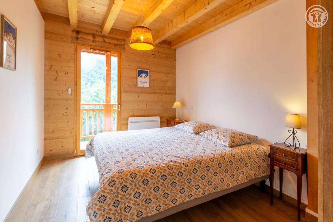 Gite auf zweieinhalb Ebenen mit Zugang von der Straße über eine Außentreppe, die zur ersten Ebene des Gite führt, einschließlich eines Eingangs, eines Skiraums und eines Schuhraums, einer kleinen Waschküche, eines Badezimmers (Badewanne) und eines Badezimmers mit Wasser ( Italienische Dusche), separates WC. Ebene 0 (Erdgeschoss): Wohnzimmer-Küchen-Loungebereich (manuell aufgeladener Pelletofen) mit Zugang zur Terrasse, Spa (3 Plätze), 2. separates WC. Ebene 1,5: 3 Schlafzimmer mit gemeinsamem Balkon (1 Doppelbett 160 x 200 cm / 1 Doppelbett 160 x 200 cm / 1 Doppelbett 160 x 200 cm, 2 Etagenbetten 90 x 190 cm).