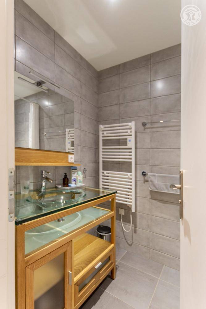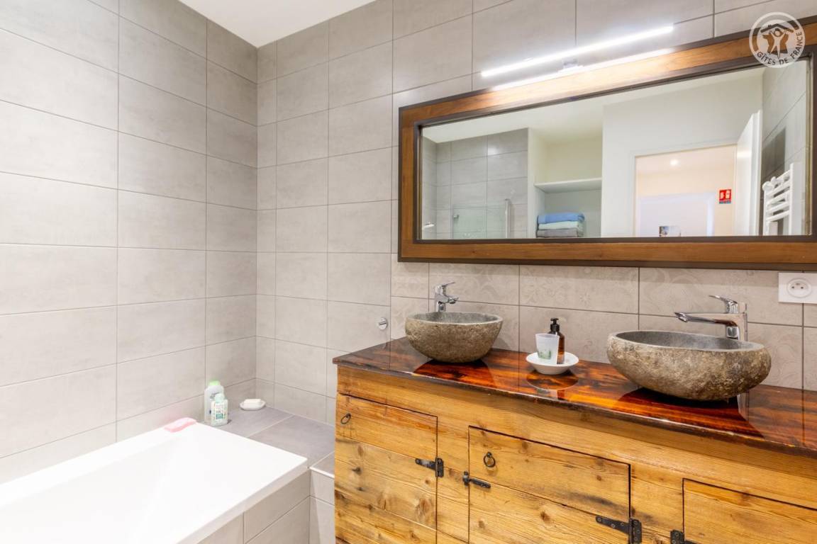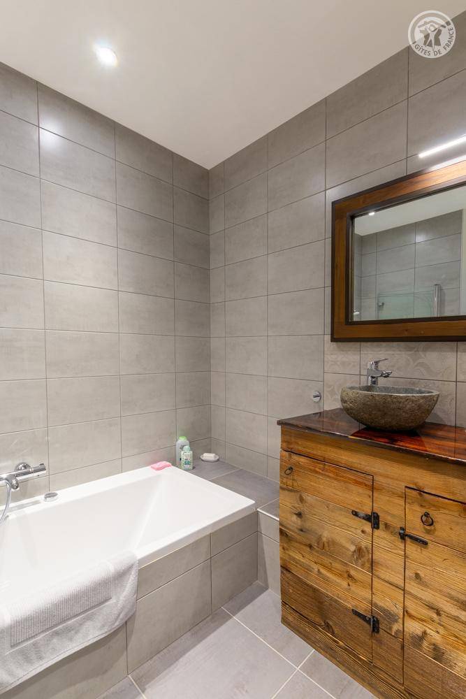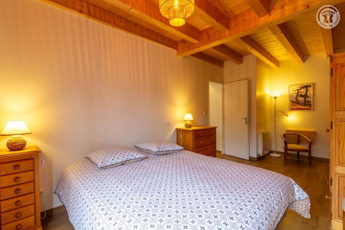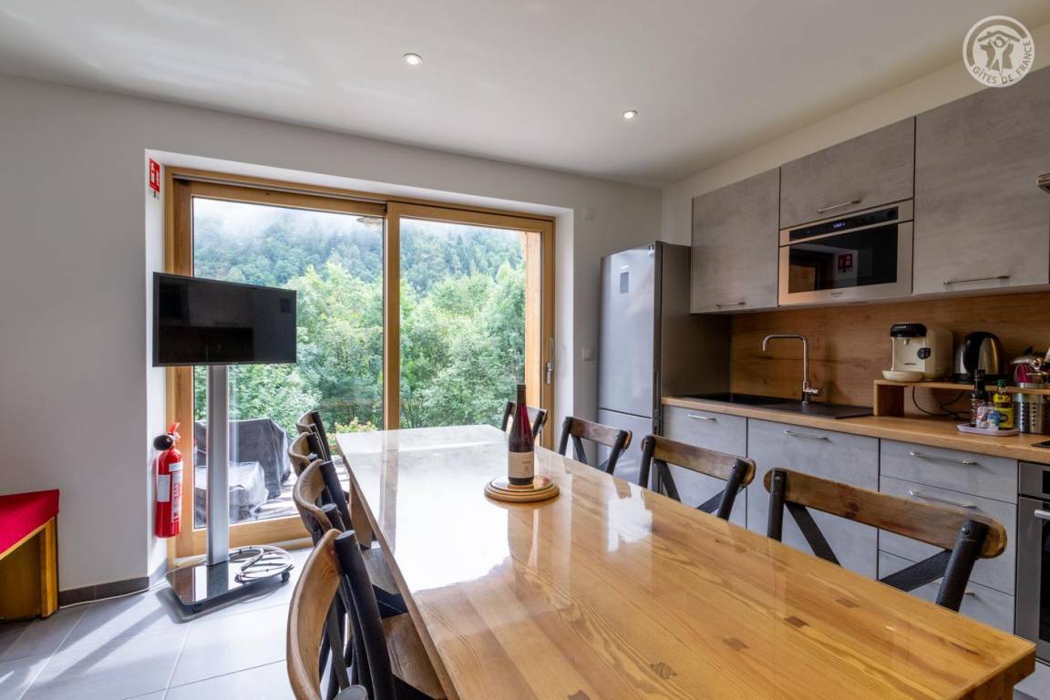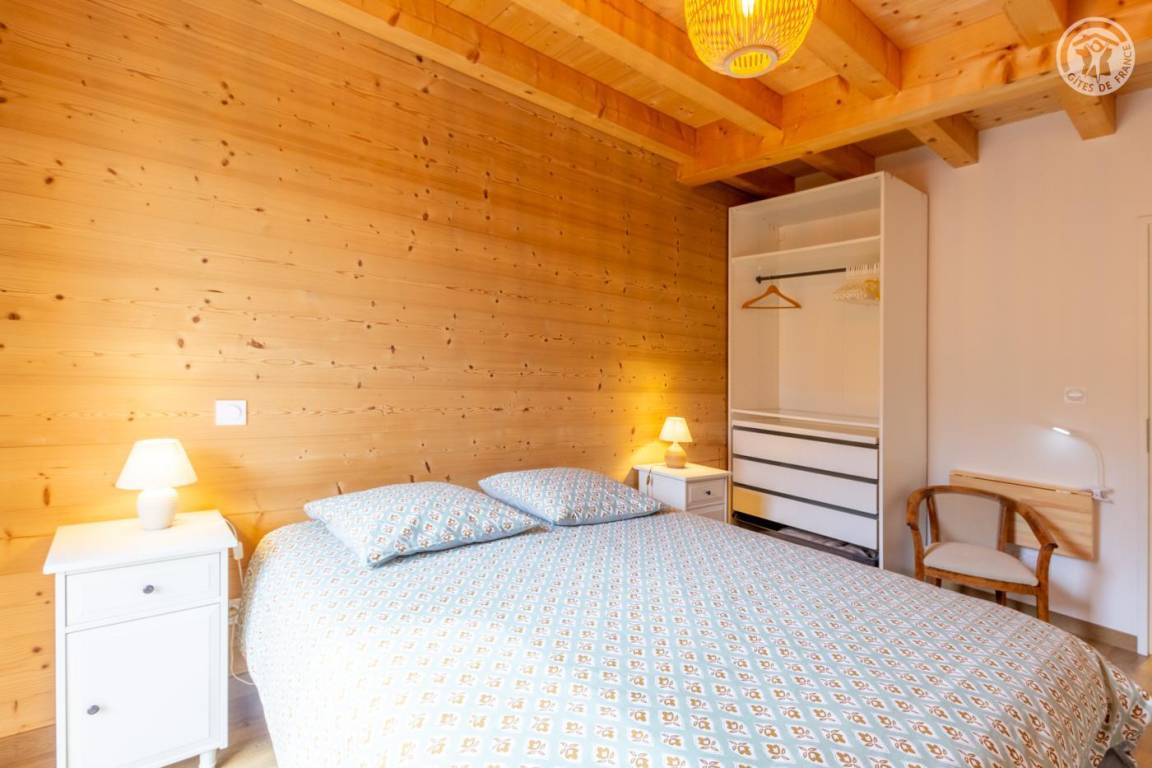 Gite auf zweieinhalb Ebenen mit Zugang von der Straße über eine Außentreppe, die zur ersten Ebene des Gite führt, einschließlich eines Eingangs, eines Skiraums und eines Schuhraums, einer kleinen Waschküche, eines Badezimmers (Badewanne) und eines Badezimmers mit Wasser ( Italienische Dusche), separates WC. Ebene 0 (Erdgeschoss): Wohnzimmer-Küchen-Loungebereich (manuell aufgeladener Pelletofen) mit Zugang zur Terrasse, Spa (3 Plätze), 2. separates WC. Ebene 1,5: 3 Schlafzimmer mit gemeinsamem Balkon (1 Doppelbett 160 x 200 cm / 1 Doppelbett 160 x 200 cm / 1 Doppelbett 160 x 200 cm, 2 Etagenbetten 90 x 190 cm).
