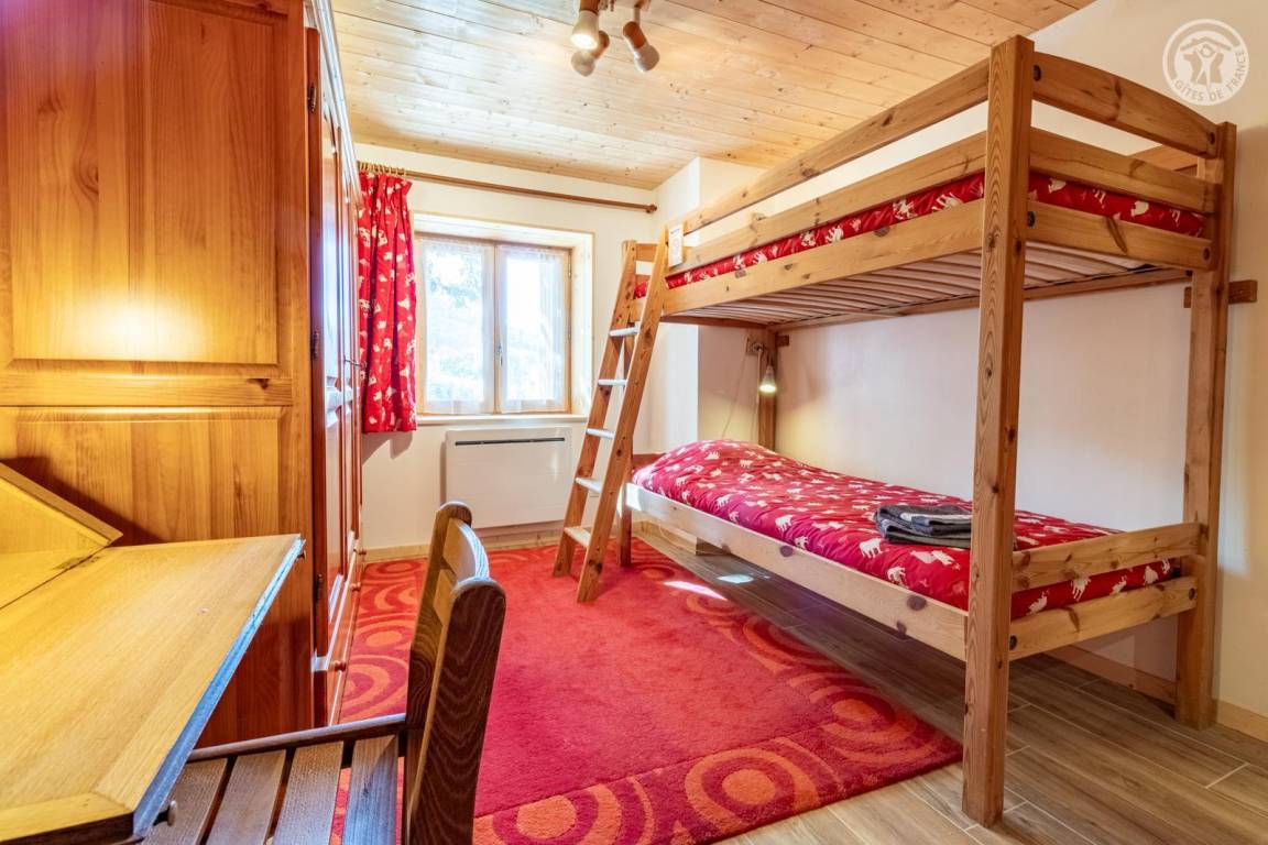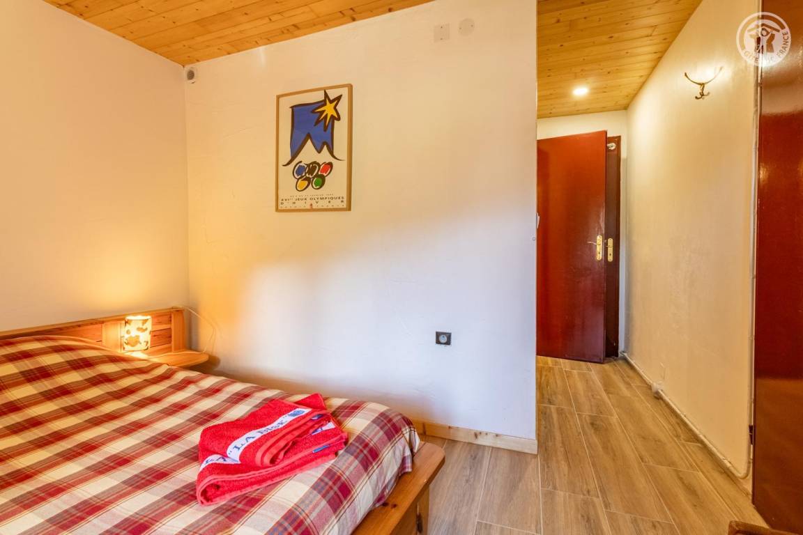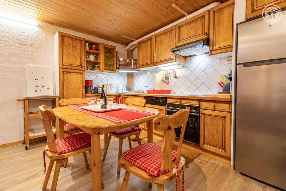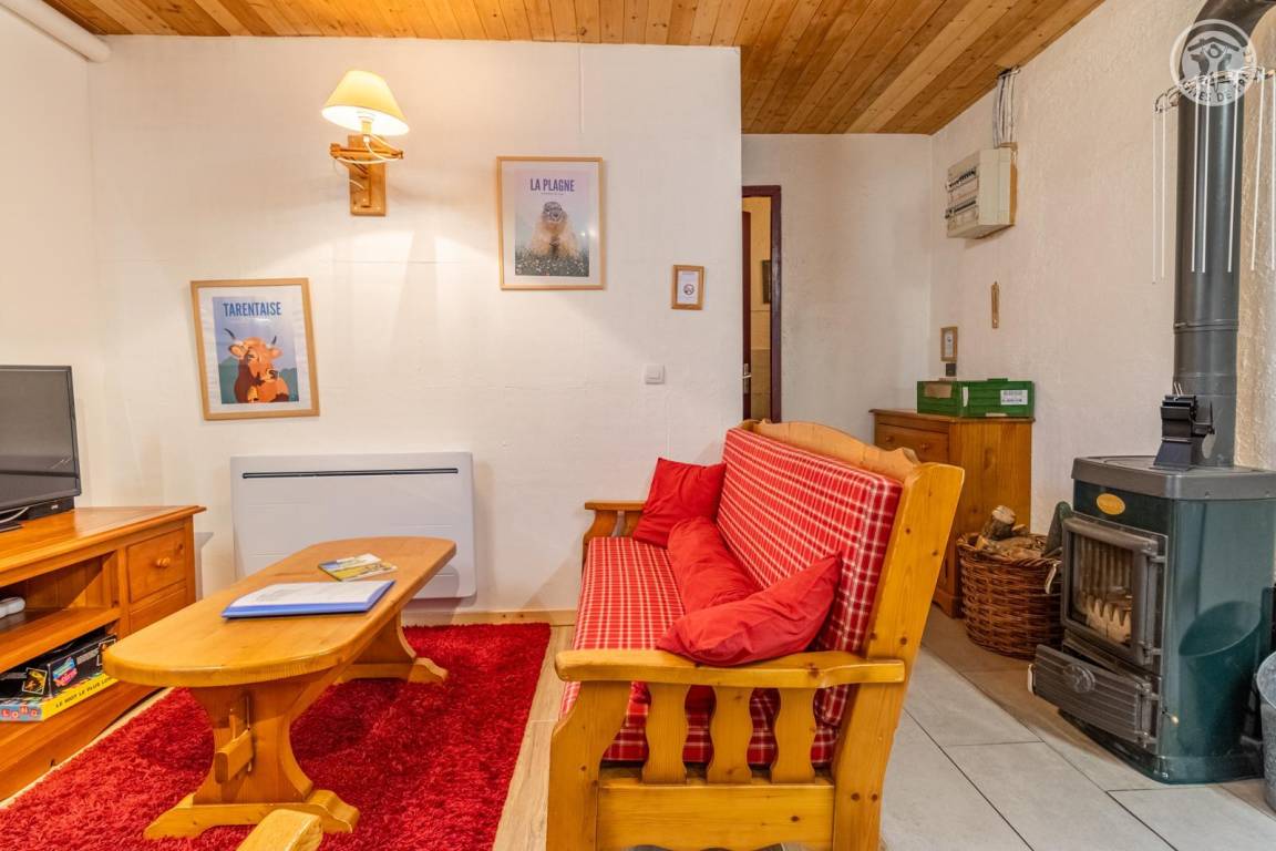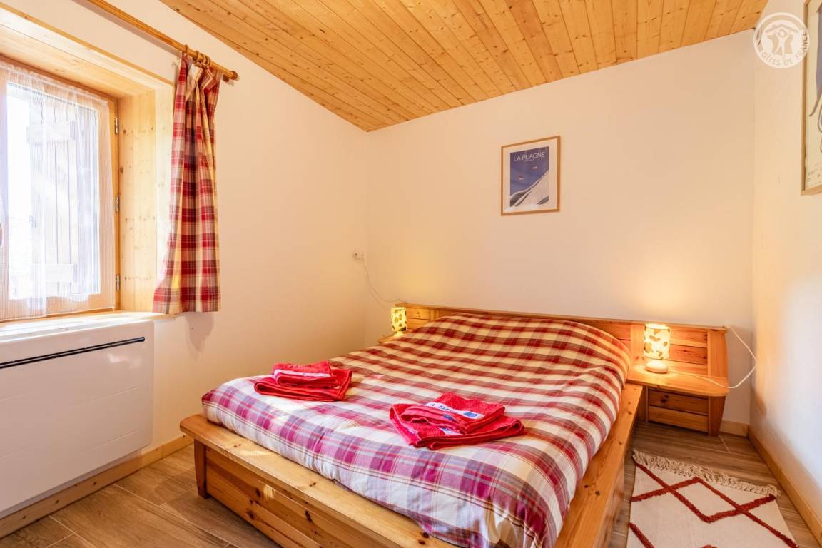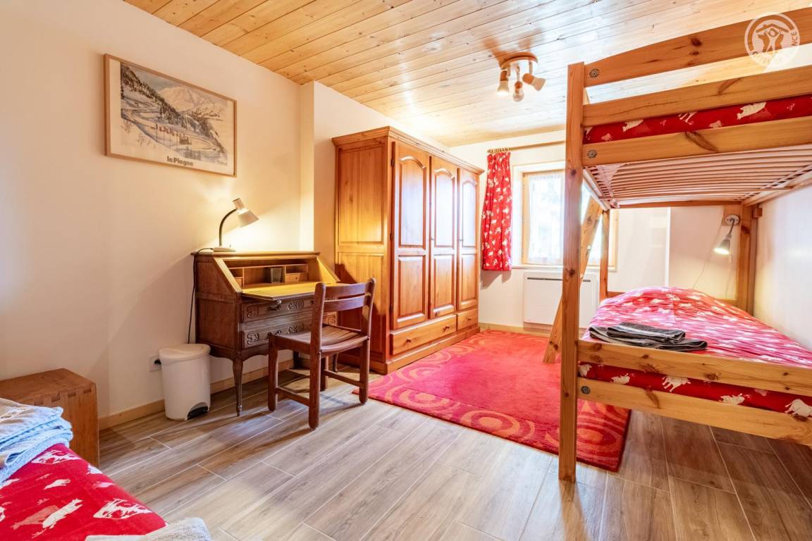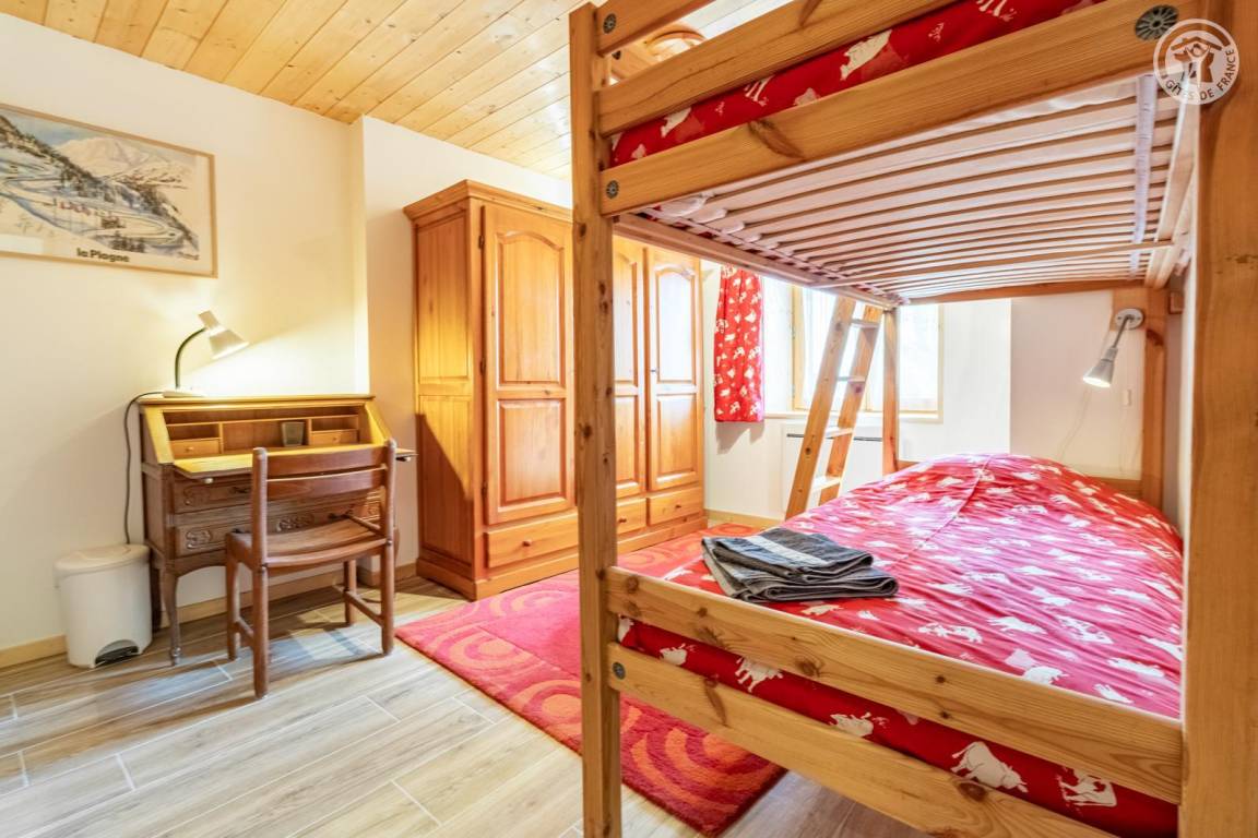 Im Erdgeschoss des Hauses der Eigentümer befindet sich auch eine weitere Touristenunterkunft. Zugang über einen Rasenweg im Freien vom Parkplatz (1 Stellplatz, unter Carport). Kleiner Balkon mit Sonnenliegen, private Terrasse mit Gemeinschaftsgrundstück vor der Unterkunft (Gemeinschaftsweg mit sehr wenig Verkehr zwischen Haus und Grundstück). Zugang über ein paar Stufen: Wohnküche mit Herd (ohne Öffnung nach außen, Tür mit Milchglasfenster), 1 Schlafzimmer mit eigenem Bad (Dusche + WC) (1 Doppelbett 140x190 cm), 1 Schlafzimmer (1 Doppelbett 140x190 cm + 2 Etagenbetten 90x190 cm, Badezimmer (Dusche), separates WC. Skiverbindung nach La Plagne 4 km. Langlaufloipe 4 km. Gewässer 6 km. Schwimmbad 10 km.