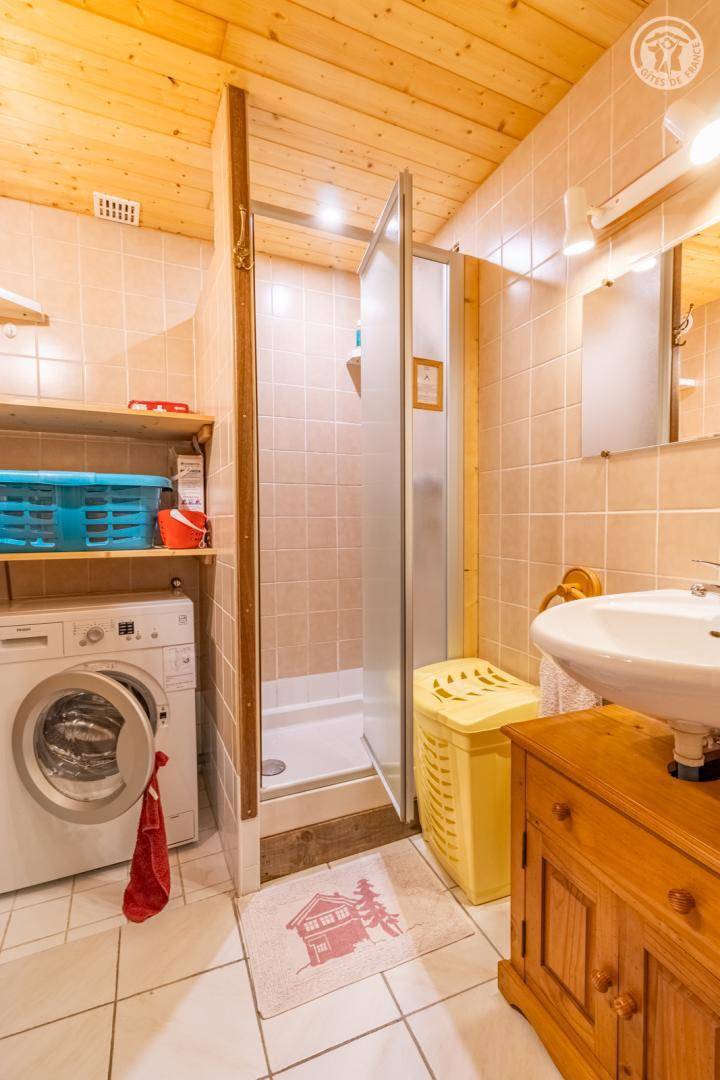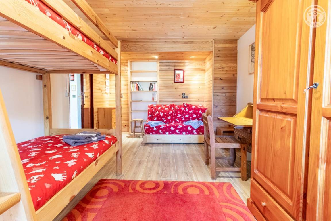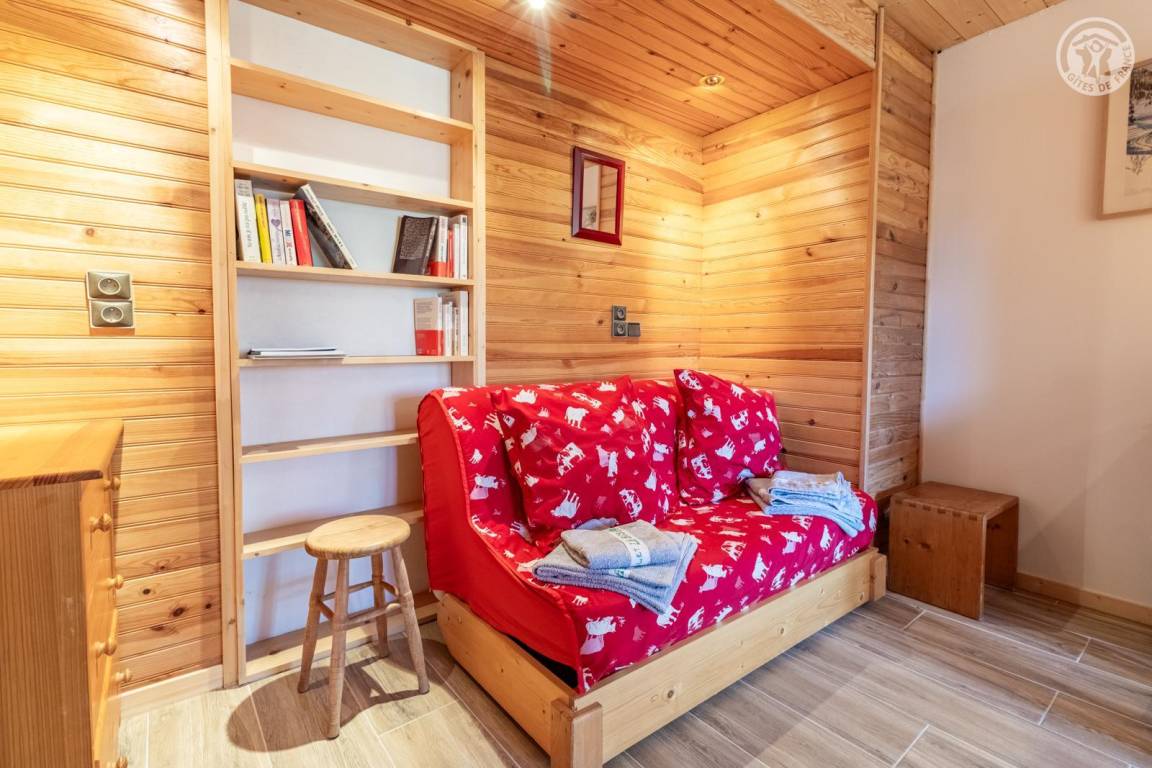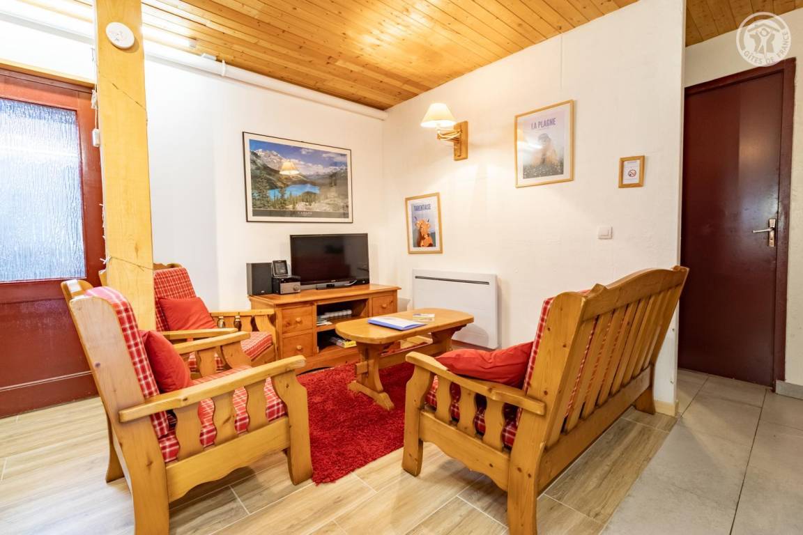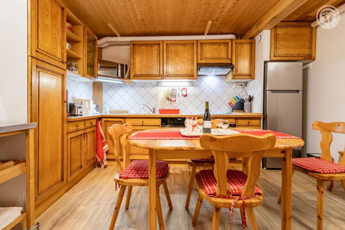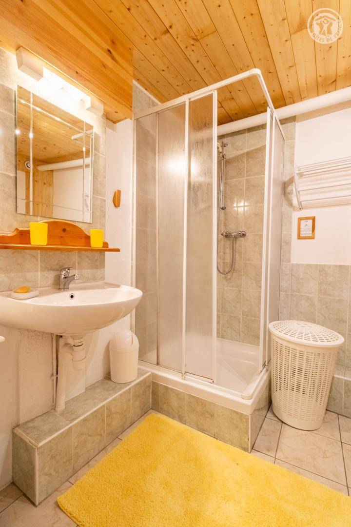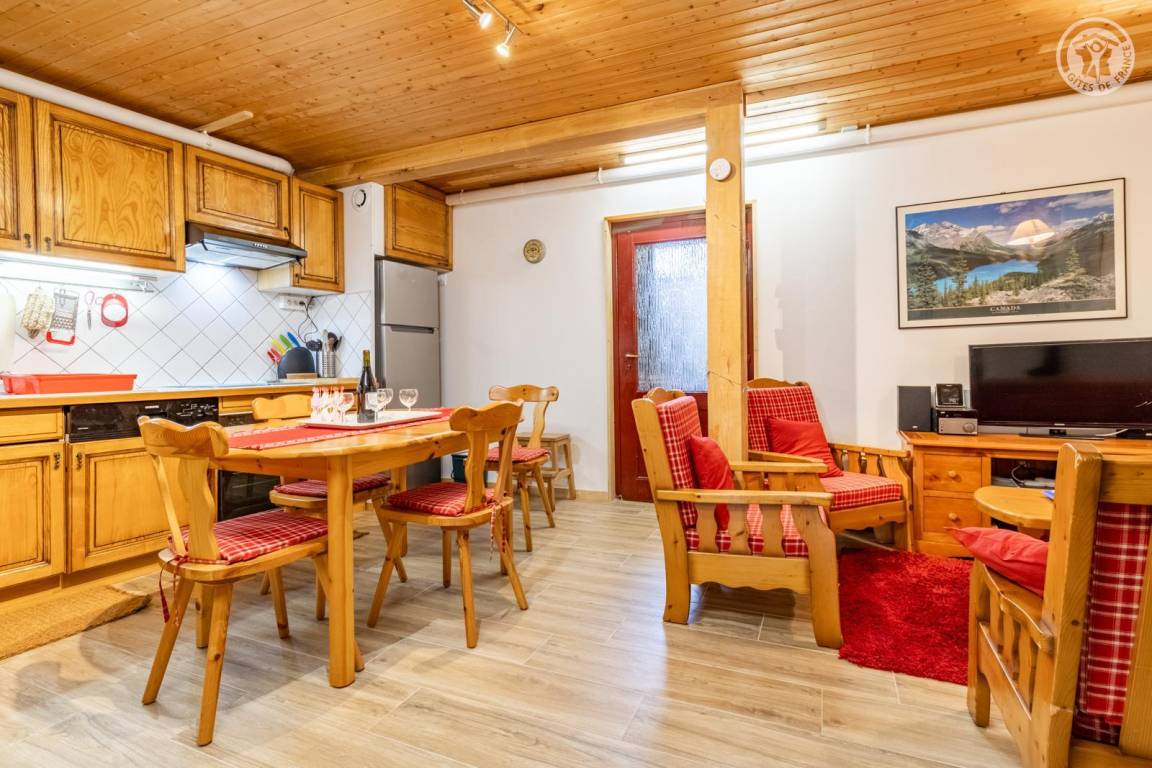 Im Erdgeschoss des Hauses der Eigentümer befindet sich auch eine weitere Touristenunterkunft. Zugang über einen Rasenweg im Freien vom Parkplatz (1 Stellplatz, unter Carport). Kleiner Balkon mit Sonnenliegen, private Terrasse mit Gemeinschaftsgrundstück vor der Unterkunft (Gemeinschaftsweg mit sehr wenig Verkehr zwischen Haus und Grundstück). Zugang über ein paar Stufen: Wohnküche mit Herd (ohne Öffnung nach außen, Tür mit Milchglasfenster), 1 Schlafzimmer mit eigenem Bad (Dusche + WC) (1 Doppelbett 140x190 cm), 1 Schlafzimmer (1 Doppelbett 140x190 cm + 2 Etagenbetten 90x190 cm, Badezimmer (Dusche), separates WC. Skiverbindung nach La Plagne 4 km. Langlaufloipe 4 km. Gewässer 6 km. Schwimmbad 10 km.