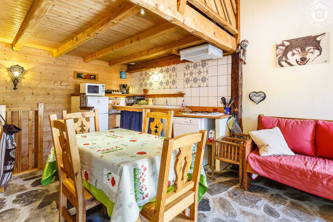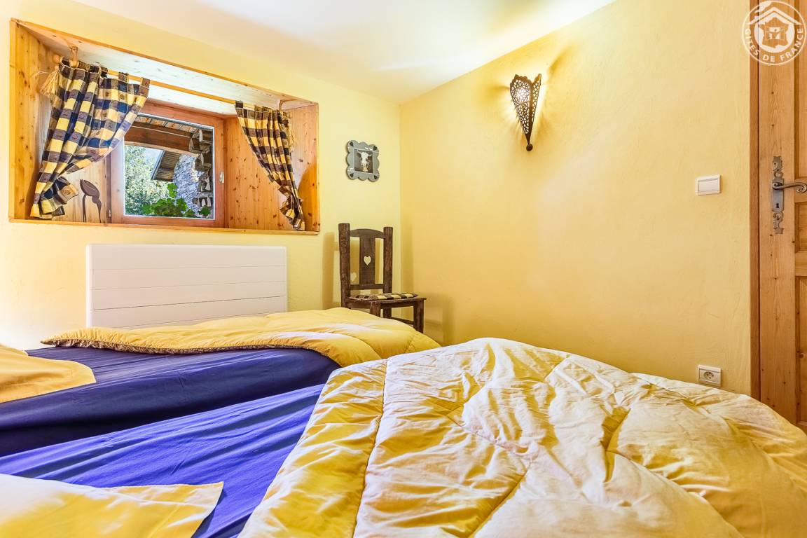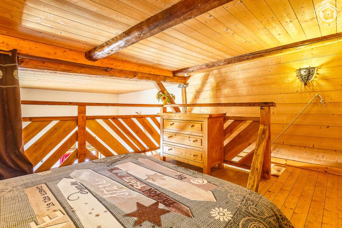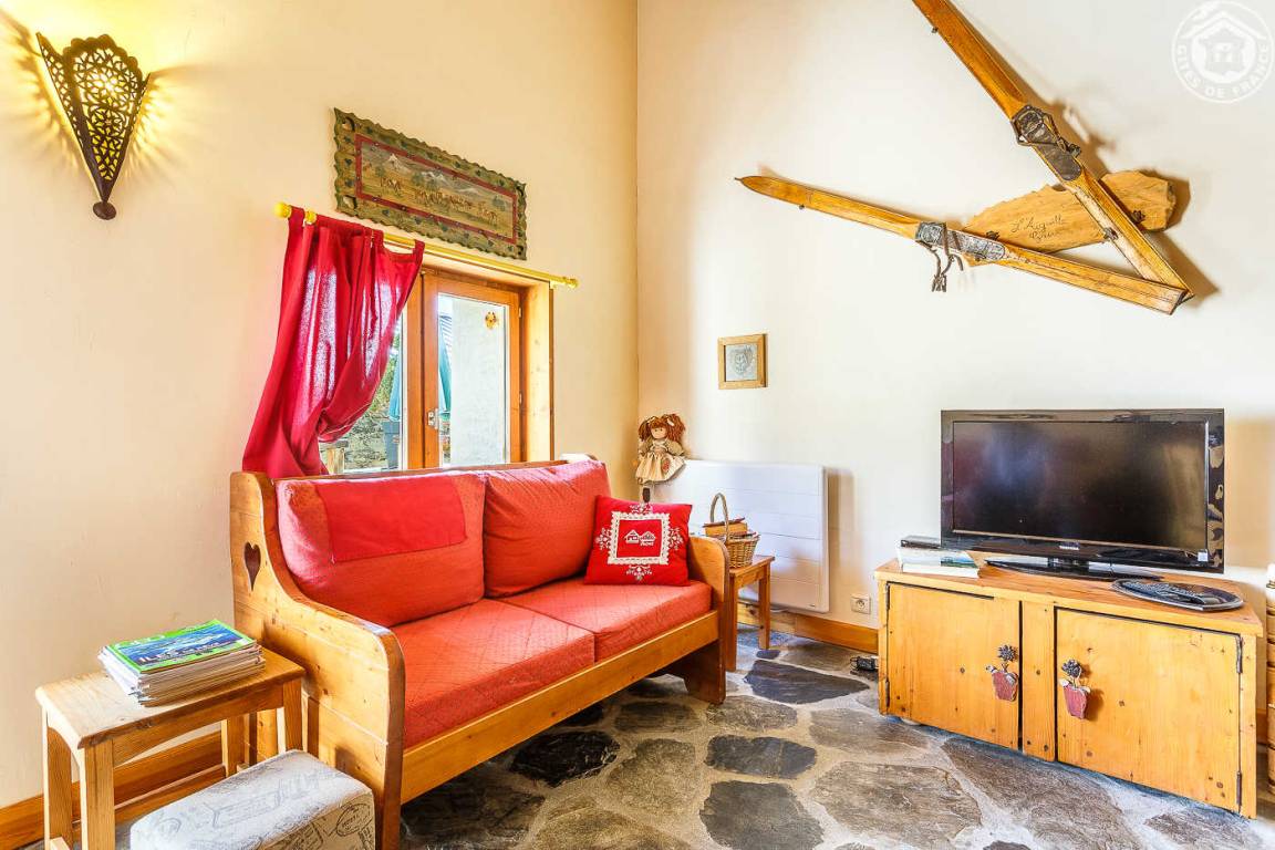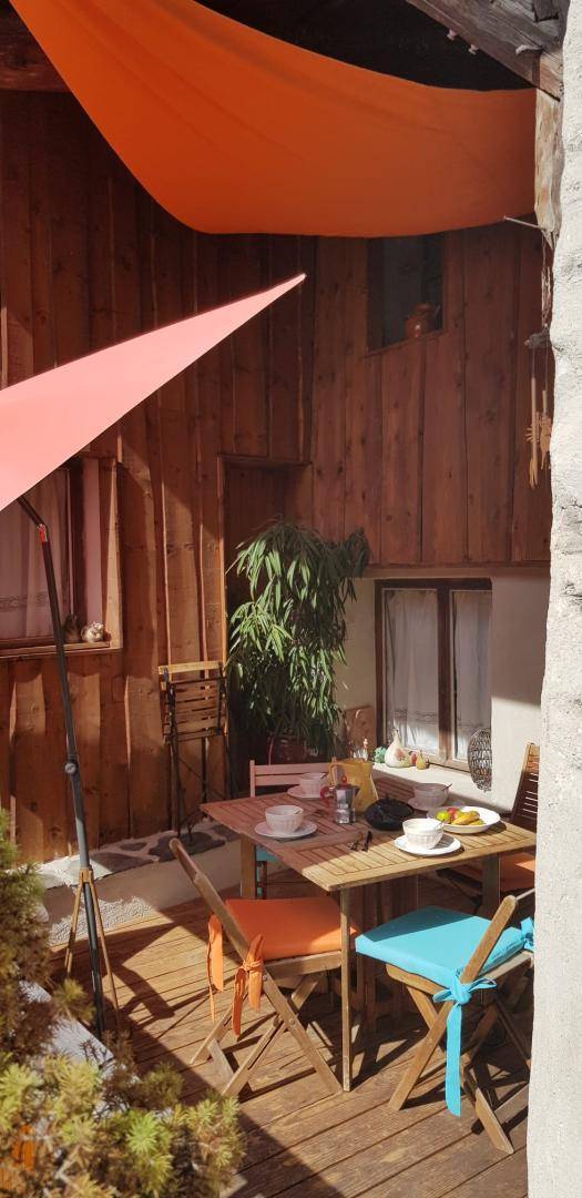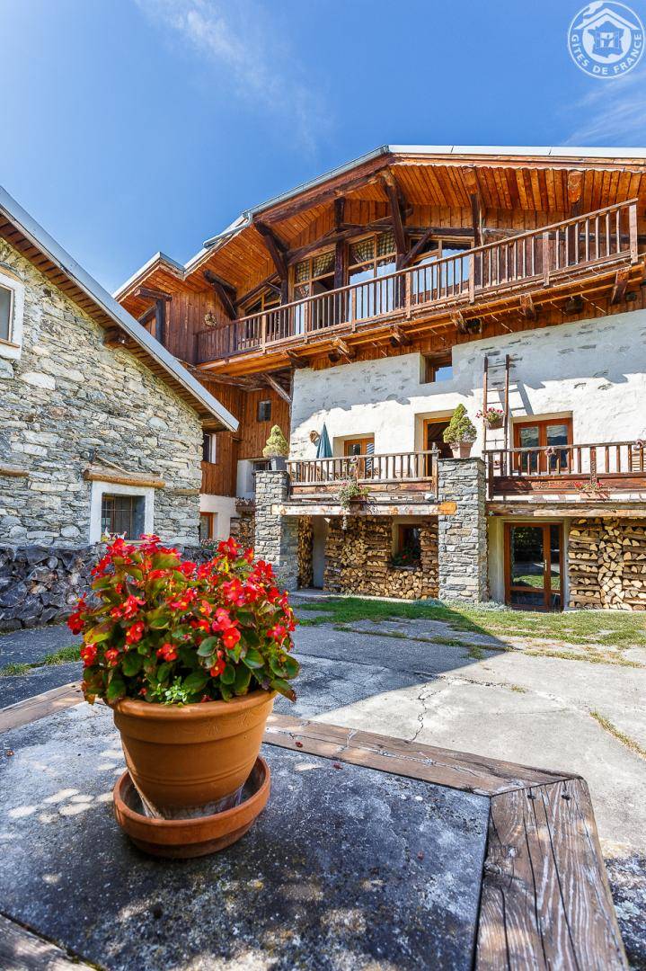 Ferienwohnung im Haus des Eigentümers. Erdgeschoss + 1. + 2. Stock: Wohnzimmer-Küchen-Loungebereich, Mezzanine (1 Doppelbett 160 x 200 cm), 1 Schlafzimmer (2 Einzelbetten, die zu 1 Doppelbett 160 x 190 cm kombiniert werden können), Badezimmer mit Wasser (Dusche mit Toilette). Balkon-Terrasse. Grundstück + Innenhof. Ski-Seilbahnverbindung Les Arcs 5 km, Montchavin-Verbindung La Plagne 12 km, Peisey-Nancroix 16 km. Gewässer 4km.